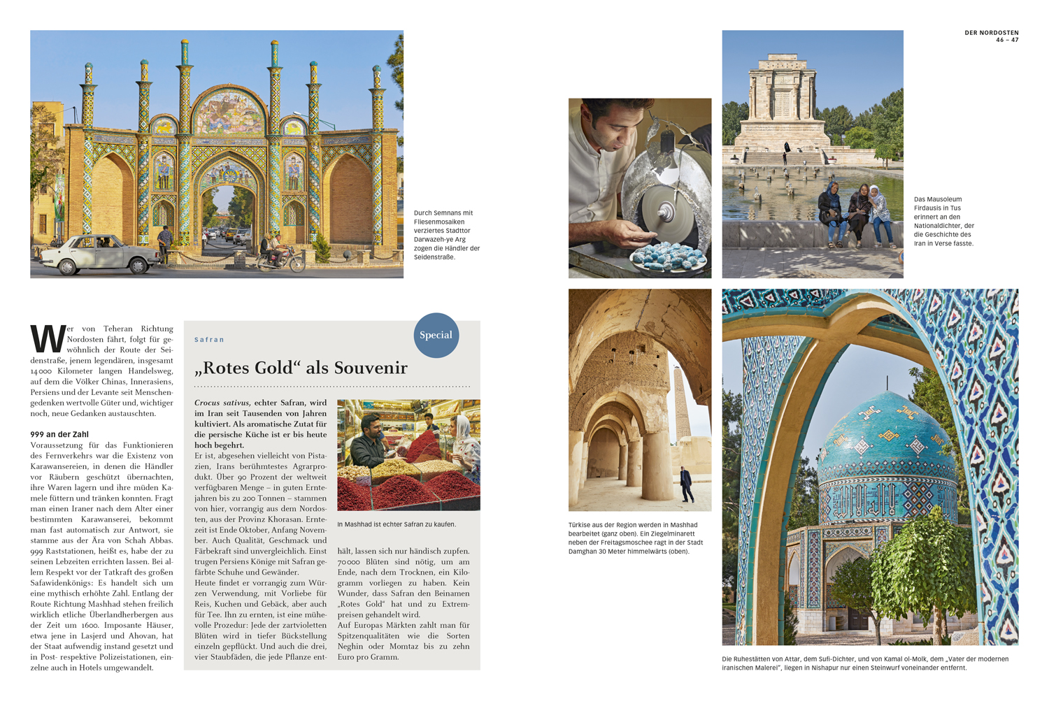| Schlagworte | Abyyaneh • Chogha Zanbil • Imam-Reza-Heiligtum in Mashhad • Isfahan • Kaschan • Kashan • Kerman • Maschhad • Pasargadae • Persepolis • Qeshm und Hormuz • Schiras • Shiraz • Täbris • Takht-e Soleyman • Teheran • Yazd |