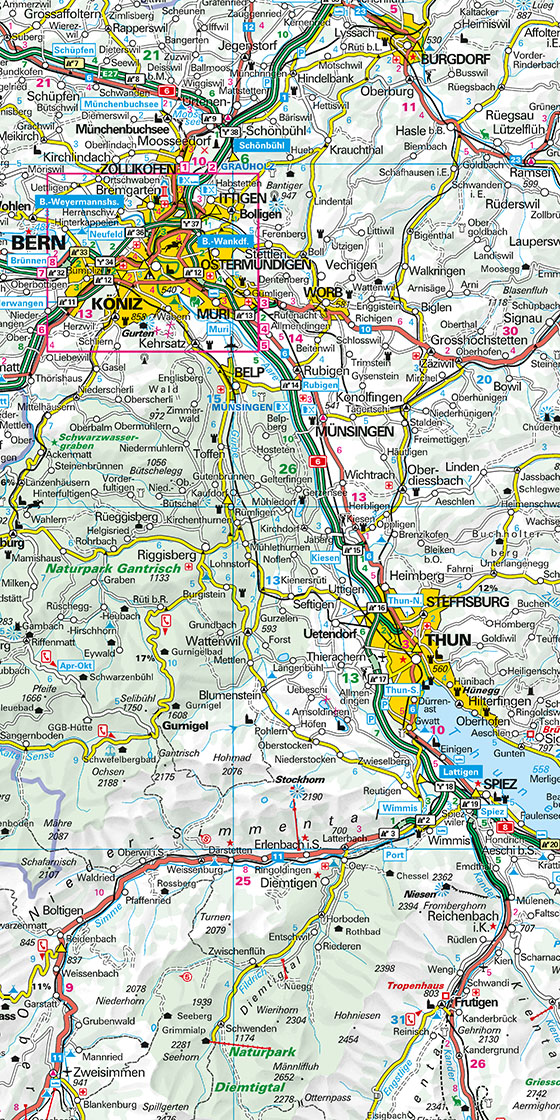 Strassenkarte Schweiz mit Transitplänen, Ortsindex, touristische Informationen und Sehenswürdigkeiten.