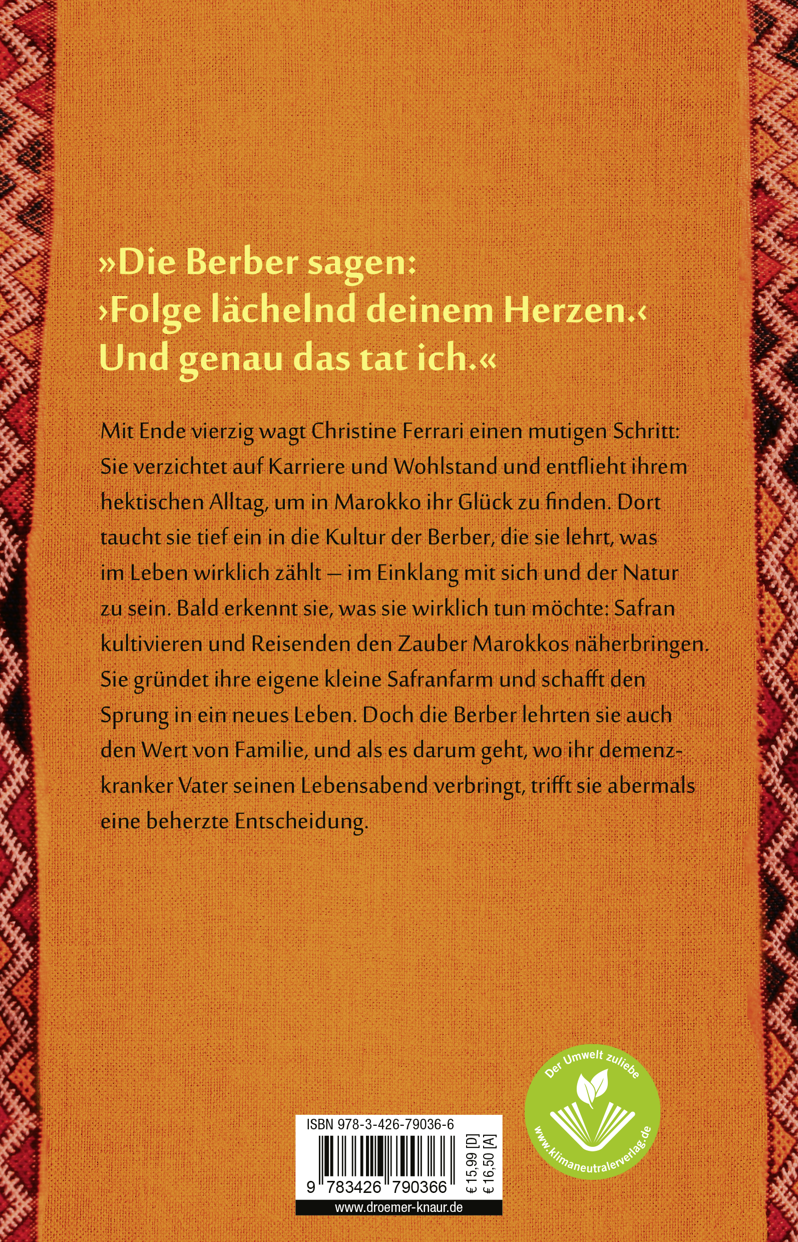lt;p>Christine Ferrari ist mit Mitte 40 frisch geschieden und mitten in einer Existenzkrise. Nach einer inspirierenden Reise in das Marokkanische Hinterland beschließt Christine Ferrari ihr Schicksal in die Hand zu nehmen: Sie steigt aus und begibt sich in Marokko auf Sinnsuche. In ihrem Memoir erzählt sie von ihrem holprigen Weg und wie sie über viele Umwege das große Glück findet. Heute betreibt sie eine gut gehende Safran-Farm. Sie kultiviert das "rote Gold" selber, verbringt den ganzen Tag an der frischen Luft und lebt nachhaltig im Einklang mit der Natur.
