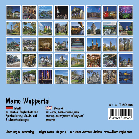 | Zusatzinfo | 80 Spielkarten (40 Bildpaare) mit 40 Stadtansichten, zweisprachige Broschüre (DE/GB) zur Stadtgeschichte und den gezeigten Fotos |