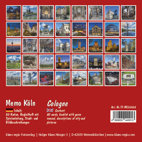 | Zusatzinfo | 80 Spielkarten (40 Bildpaare) mit 40 Stadtansichten, zweisprachige Broschüre (DE/GB) zur Stadtgeschichte und den gezeigten Fotos |
