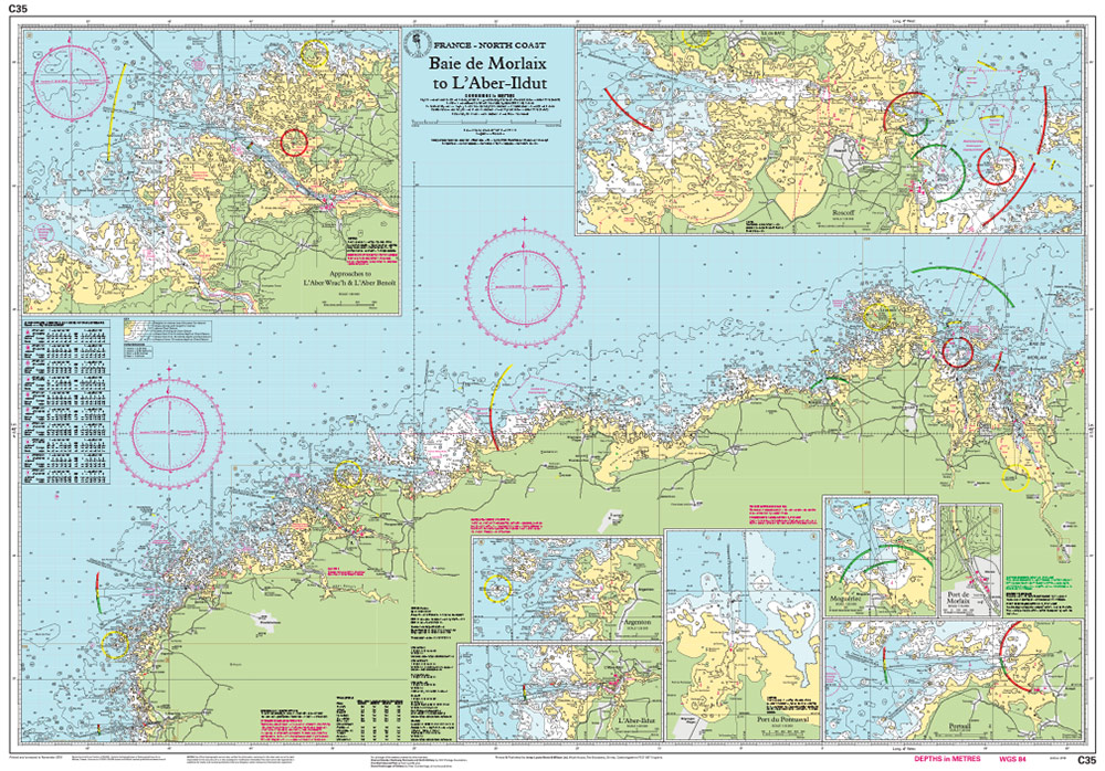 On this edition the chart specification has been improved to show coloured light flashes. Updated depth surveys have been included where applicable. The harbour plans of L'Aber-Ildut and Argenton are now drawn at a scale of 1:25 000. The plan showing the approaches to Roscoff has been extended east to include better approach coverage to Bloscon Marina. There has been general updating throughout.