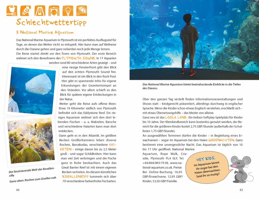 In Cornwall und Devon wird die atemberaubende Natur zum Abenteuerspielplatz. Dieser Reiseführer zeigt Ihnen familienerprobte Ausflugsziele zwischen dramatischen Küsten, traumhaften Stränden, weiten Moorlandschaften und bezaubernden Gärten. Ob man nun auf den Spuren alter Sagen und Legenden unterwegs ist, durch Wasserfälle klettert, geheimnisvolle Höhlen erkundet, Surfen lernt oder auf Robbensafari unterwegs ist - hier kommt ganz bestimmt keine Langeweile auf. Lassen Sie sich inspirieren von tollen Ideen für Groß und Klein und freuen Sie sich auf unvergessliche gemeinsame Urlaubserlebnisse.