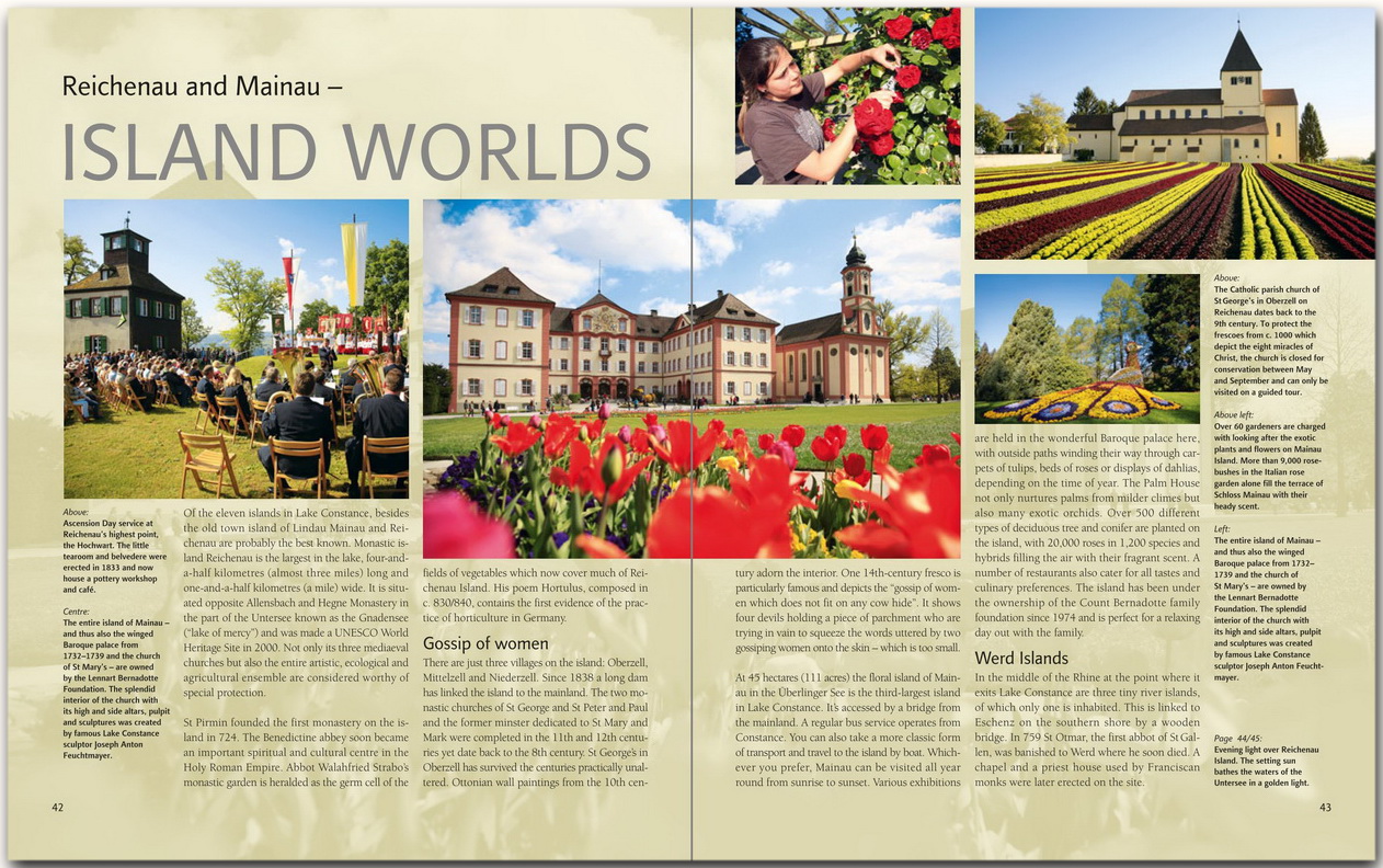 Rund 260 Bilder zeigen den Bodensee und seine Umgebung am deutschen Ufer, in Vorarlberg und der Ostschweiz in allen Facetten. Sechs Specials berichten unter anderem über die Klosterinsel Reichenau, die zum UNESCO-Welterbe zählt, und die kulinarischen Entdeckungen, die man auf einer Reise durch die Region machen kann.