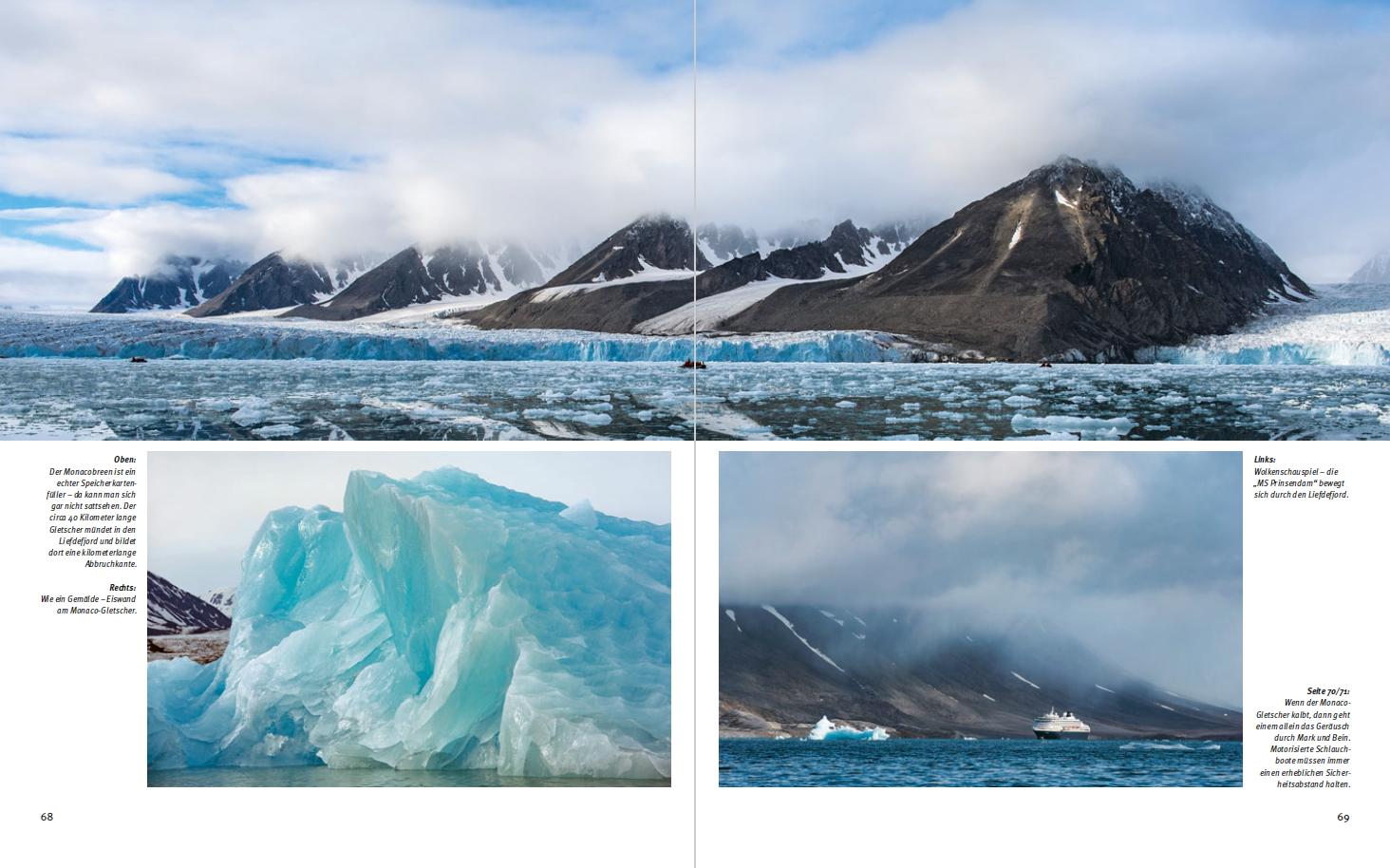 Eine Reise durch Spitzbergen und all die Inselwelten, das ist Spannung pur: „Da habe ich mich gerade in die Koje gehauen, von der See in die Einschlafphase wiegen lassen – dann die Borddurchsage. Zwei Blauwale in Sicht. Erlebnisalarm. Raritäten im Nordatlantik. Blitzschnell rein in warme Kleidung, raus aus der Kabine ans kühle Deck. Der Käpten dreht bei, drosselt das Tempo auf zwei Knoten. Punktgenau tauchen sie an Backbord auf, wie ferngesteuert für uns Expeditionskreuzfahrer der Moderne. Die Giganten der Meere zeigen ihre Rückenpartien, dunkle Massen in Norwegens Mitternachtssonne, die das Firmament in Gold- und Gelbtönen vollkitscht. Der Blas der Riesen faucht und schnauft, steigt wie Geysire in Kleinformat auf.“