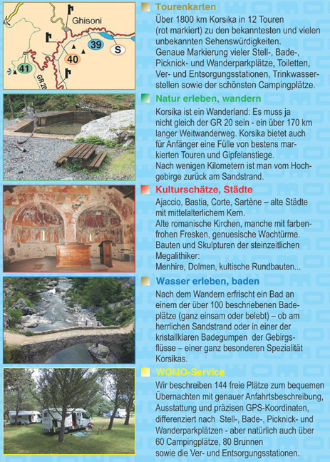 TourenkartenÜber 1800 km Korsika in 12 Touren (rot markiert) zu den bekanntesten und vielen unbekannten Sehenswürdigkeiten. Genaue Markierung vieler Stell-, Bade-, Picknick- und Wanderparkplätze, Toiletten, Ver- und Entsorgungsstationen, Trinkwasserstellen sowie der schönsten Campingplätze.Narur erleben, wandernKorsika ist ein Wanderland: Es muss ja nicht gleich der GR20 sein - ein über 170 km langer Weitwanderweg. Korsika bietet auch für Anfänger eine Fülle von bestens markierten Touren und Gipfelanstiege. Nach wenigen Kilometern ist man vom Hochgebirge zurück am Sandstrand.Kulturschätze, StädteAjaccio, Bastia, Corte, Sarténe - alte Städte mit mittelalterlichem Kern. Alte romanische Kirchen, manche mit farbenfrohen Fresken, genuesische Wachtürme, Bauten und Skulpturen der steinzeitlichen Magalithiker: Menhire, Dolmen, kultische Rundbauten ...Wasser erleben, badenNach dem Wandern erfrischt ein Bad an einem der über 100 beschriebenen Badeplätze (ganz einsam oder belebt) - ob am herrlichen Sandstrand oder in einer der kristallklaren Badegumpen der Gebirgsflüsse -einer ganz besonderen Spezialität Korsikas.WOMO-ServiceWir beschreiben 144 freie Plätze zum bequemen Übernachten mit genauer Anfahrtsbeschreibung, Ausstattung und präzisen GPS-Koordinaten, differenziert nach Stell-, Bade-, Picknick und Wanderparkplätzen - aber natürlich auch über 60 Campingplätze, 80 Brunnen sowie die Ver- und Entsorgungsstationen.
