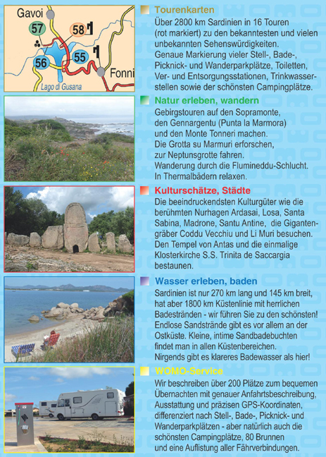 TOURENKARTENÜber 2800 km Sardinien in 16 Touren (rot markiert) zu den bekanntesten und vielen unbekannten Sehenswürdigkeiten. Genaue Markierung vieler Stell-, Bade-, Picknick- und Wanderparkplätze, Toiletten, Ver-und Entsorgungsstationen, Trinkwasserstellen sowie der schönsten Campingplätze.NATUR ERLEBEN, WANDERNGebirgstouren auf den Sopramonte, den Gennargentu (Punta la Marmora) und den Monte Tonneri machen. Die Grotta su Marmuri erforschen, zur Neptunsgrotte fahren. Wanderung durch die Flumineddu-Schlucht. In Thermalbädern relaxen.KULTURSCHÄTZE, STÄDTEDie beeindruckensten Kulturgüter wie die berühmten Nurhagen Ardasai, Losa, Santa Sabina, Madrone, Santu Antine, die Gigantengräber Coddu Vecchiu und Li Muri besuchen. Den Tempel von Antas und die einmalige Klosterkirche S.S. Trinita de Saccargia bestaunen.WASSER ERLEBEN, BADENSardinien ist nur 270 km lang und 145 km breit, hat aber 1800 km Küstenlinie mit herrlichen Badestränden - wir führen Sie zu den schönsten!Endlose Sandstrände gibt es vor allem an der Ostküste. Kleine, intime Sandbadebuchten findet man in allen Küstenbereichen. Nirgens gibt es klareres Badewasser als hier!WOMO-SERVICEWir beschreiben über 200 Plätze zum bequemen Übernachten mit genauer Anfahrtsbeschreibung, Ausstattung und präzisen GPS-Koordinaten, differenziert nach Stell-, Bade-, Picknick- und Wanderparkplätzen - aber natürlich auch die schönsten Campingplätze, 80 Brunnen und eine Auflistung aller Fährverbindungen.
