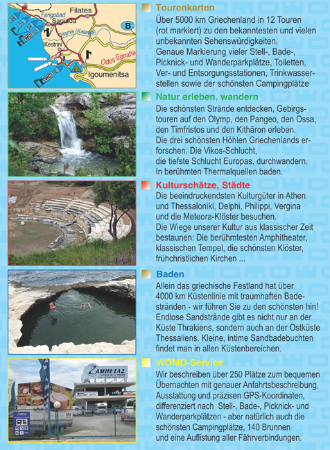 TOURENKARTENÜber 5000 km Griechenland in 12 Touren (rot markiert) zu den bekanntesten und vielen unbekannten Sehenswürdigkeiten. Genaue Markierung vieler Stell-, Bade-, Picknick- und Wanderparkplätze, Toiletten, Ver-und Entsorgungsstationen, Trinkwasserstellen sowie der schönsten Campingplätze.NATUR ERLEBEN- WANDERN Die schönsten Strände entdecken. Gebirgstouren auf den Olymp, den Pangeo, den Ossa, den Timfristos und den Kithäron erleben. Die drei schönsten Höhlen Griechenlands erforschen. Die Vikos-Schlucht, die tiefste Schlucht Europas, durchwandern. In berühmten Thermalquellen baden. KULTURSCHÄTZE, STÄDTE Die beeindruckensten Kulturgüter wie z.B. in Athen und Thessaloniki, Delphi, Philippi, Thermos und die Meteora-Klöster besuchen.Die Wiege unserer Kultur aus klassischer Zeit bestaunen. Die berühmtesten Amphitheater, klassischen Tempel, die schönsten Klöster, frühchristlichen Kirchen. BADEN Allein das griechische Festland hat über 4000 km Küstenlinie mit traumhaften Badestränden - wir führen Sie zu den schönsten hin!Endlose Sandstrände gibt es nicht nur an der Küste Thrakiens, sondern auch an der Ostküste Thessaliens. Kleine, intime Sandbadebuchten findet man in allen Küstenbereichen. WOMO-SERVICEWir beschreiben über 250 Plätze zum bequemen Übernachten mit genauer Anfahrtsbeschreibung, Ausstattung und präzisen GPS-Koordinaten, differenziert nach Stell-, Bade-, Picknick- und Wanderparkplätzen - aber natürlich auch die schönsten Campingplätze, 140 Brunnen und eine Auflistung aller Fährverbindungen.