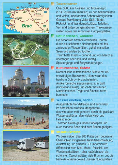 TOURENKARTENÜber 3700 km Kroatien und Montenegro in 14 Touren zu den bekanntesten und vielen unbekannten Sehenswürdigkeiten.NATUR ERLEBEN, WANDERNBegleiten Sie uns durch die schönsten Nationalparks mit ihren faszinierenden Wasserwelten, wilden Schluchten und geheimnisvollen Wäldern. Erobern Sie traumhafte Inseln, mal von duftender Macchia überzogen, mal kahl und karstig. FlanierenSie auf bequemen Spazierwegen oder wandern Sie durch die herrliche Natur. KULTURSCHÄTZE, STÄDTEBummeln Sie durch romantische mittelalterliche Städte wie z.B. Zadar, Trogir oder Dubrovnik. Es sind wahre Schatzkästchen, gefüllt mit altehrwürdigen Bauwerken. Fühlen und erleben Sie bewegte Landesgeschichten. Bestaunen Sie die Zeugnisse römischer Baukunst -sei es die Arena in Pula oder der Diokletian-Palast in Split. WASSER ERLEBEN, BADENAn der langen Küstenlinie Kroatiens erwarten Sie traumhafte Buchten mit herrlichen Fels- und Kiesstränden! Das glasklare Wasser zieht Schwimmer und Taucher gleichermaßen magisch an. Scheinbar nicht enden wollende, feine Sandstrände entdecken Sie vor allem im Süden Montenegros.WOMO-SERVICEWir beschreiben rund 230 Plätze zum bequemen Übernachten mit genauer Anfahrtsbeschreibung, Ausstattung und präzisen GPS Koordinaten, differenziert nach Stell-, Bade-, Picknick- und Wanderparkplätze - aber natürlich auch die schönsten Campingplätze, viele Brunnen und die beste Anreisestrecke mit Übernachtungsplätzen.