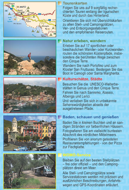 Folgen Sie uns auf 9 sorgfältig recherchierte Touren entlang der ligurischen Küste und durch das Hinterland. Orientieren Sie sich mit Übersichtskarten zu allen Stell- und Campingplätzen, Ver-und Entsorgungsstationen und den empfohlenen Reiserouten.