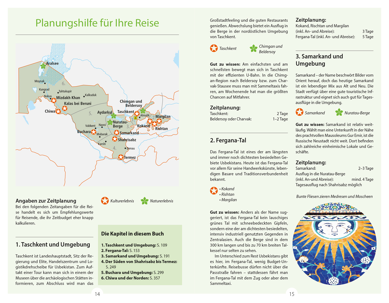 Wissenswertes über Usbekistan Wissenswertes für die Reise, Kulinarisches Lexikon, Sprachführer, Taschkent und Umgebung, Fergana-Tal, Samarkand und Umgebung, Der Süden von Shahrisabz bis Termez, Buchara und Umgebung, Chiwa und der Norden, 32 Karten und Pläne plus eine separate Usbekistan- Reisekarte im Maßstab 1:1.000.000.