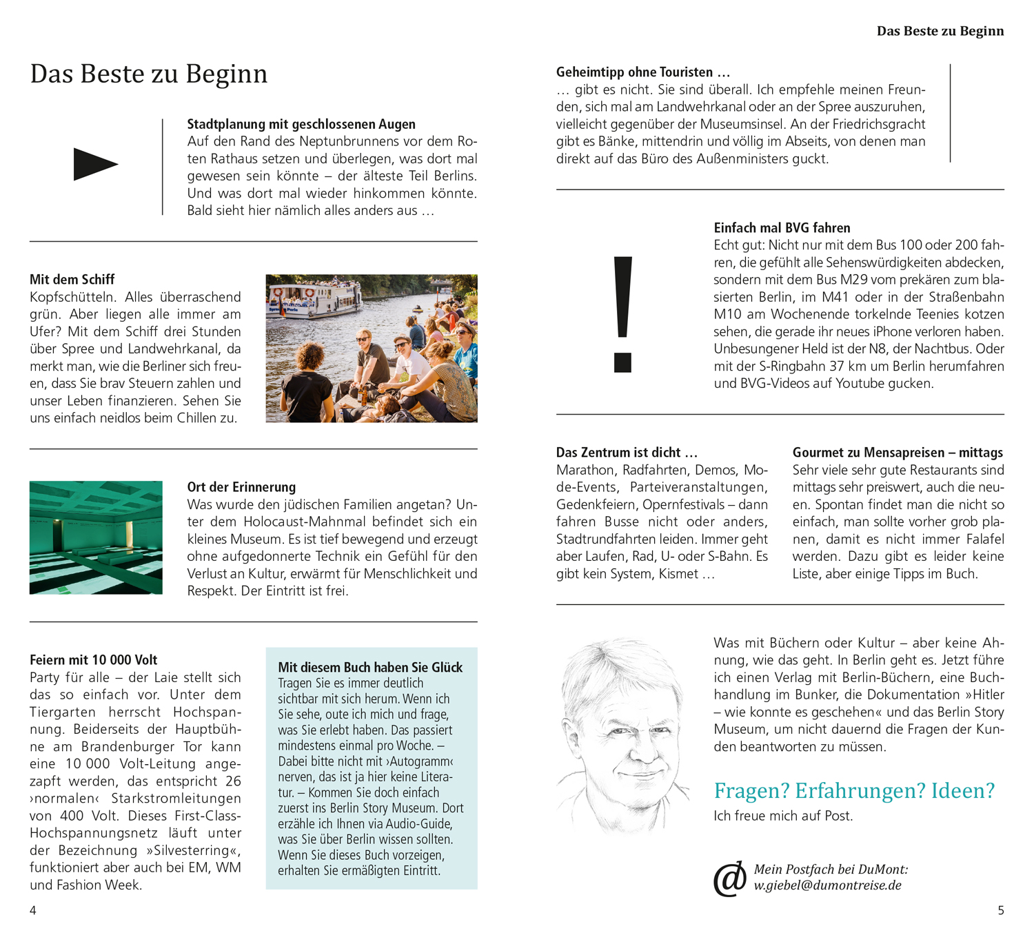 Das Beste zu Beginn. Das ist Berlin. Berlin in Zahlen. Was ist wo? Augenblicke. Ihr Berlin-Kompass. 15 Direktkapitel. Berliner Museumslandschaft. Geschichte und Zeitgeschichte. Pause - einfach mal abschalten. In fremden Betten. Satt & glücklich. Stöbern & entdecken. Wenn die Nacht beginnt. Hin & weg. O- Ton Berlin. Kennen Sie die?