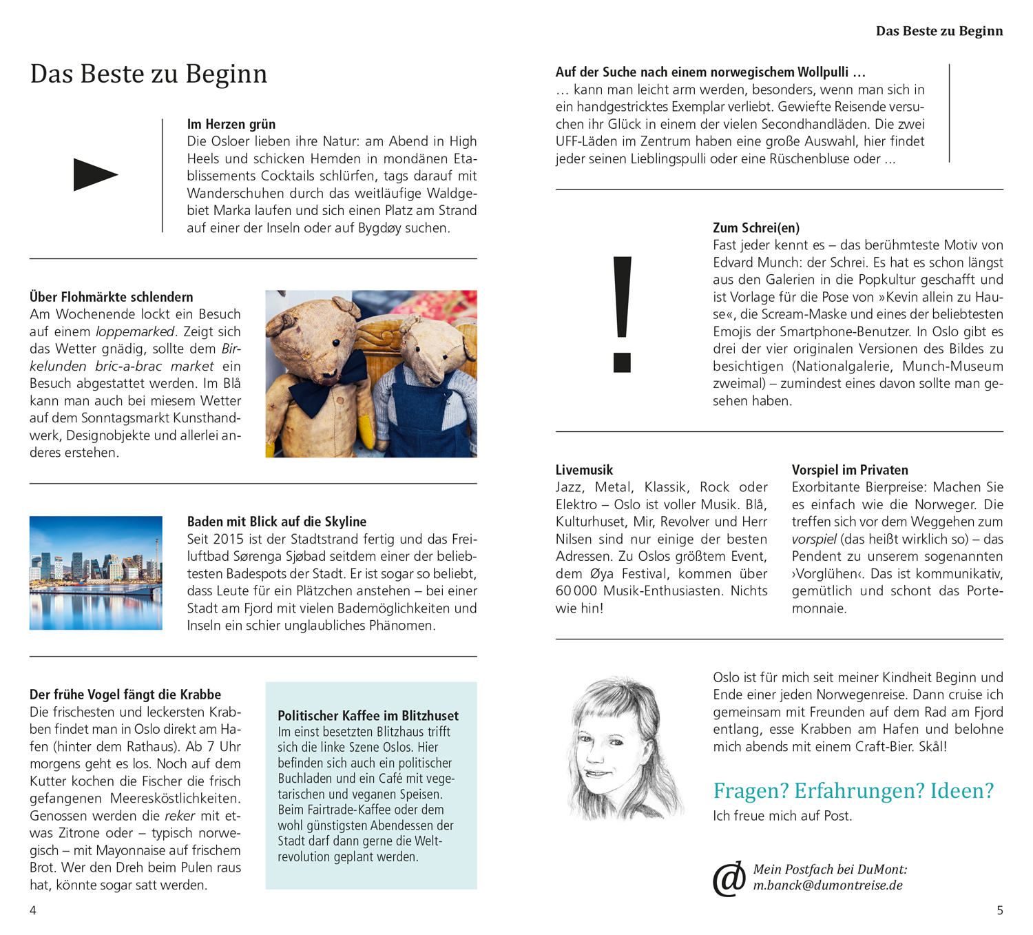 Das Beste zu Beginn. Das ist Oslo. Oslo in Zahlen. Was ist wo? Augenblicke. Ihr Oslo-Kompass. 15 Direktkapitel. Osloer Museumslandschaft. Oslo alt und neu - 1000 Jahre Stadtgeschichte. Pause - einfach mal abschalten. In fremden Betten. Satt & glücklich. Stöbern & entdecken. Wenn die Nacht beginnt. Hin & weg. O-Ton Oslo. Kennen Sie die?
