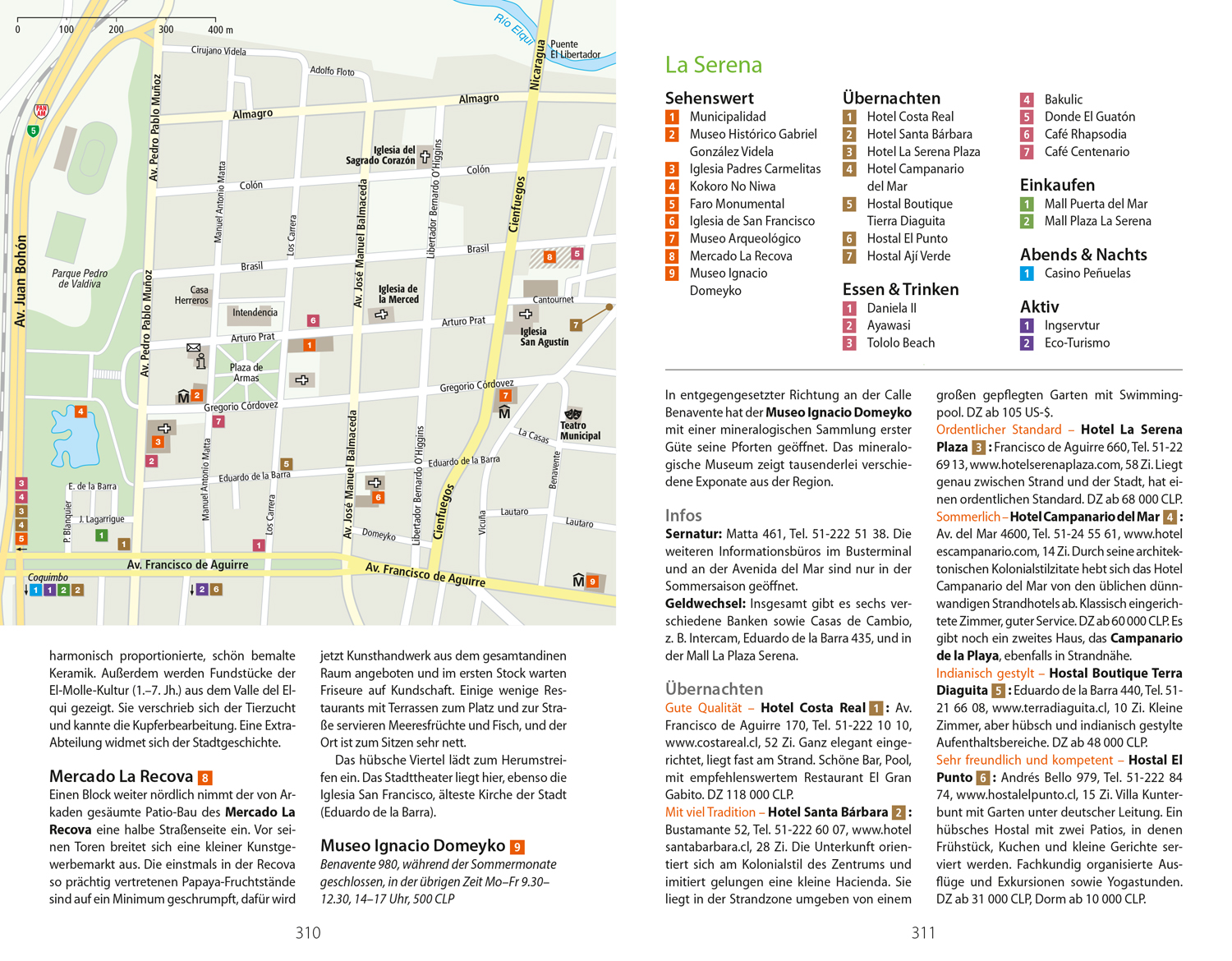 Wissenswertes über Chile und die Osterinsel, Wissenswertes für die Reise, Kulinarisches Lexikon, Sprachführer, Santiago und die Zentralküste, Kleiner Süden und Isla de Chiloé, Carretera Austral, Magallanes und Feuerland, Kleiner Norden mit La Serena und Copiapó, Großer Norden mit San Pedro de Atacama, Osterinsel und Juan-Fernández-Inseln, 46 Karten und Pläne plus eine separate Reisekarte zu Chile und die Osterinsel im Maßstab 1:1.800.000.
