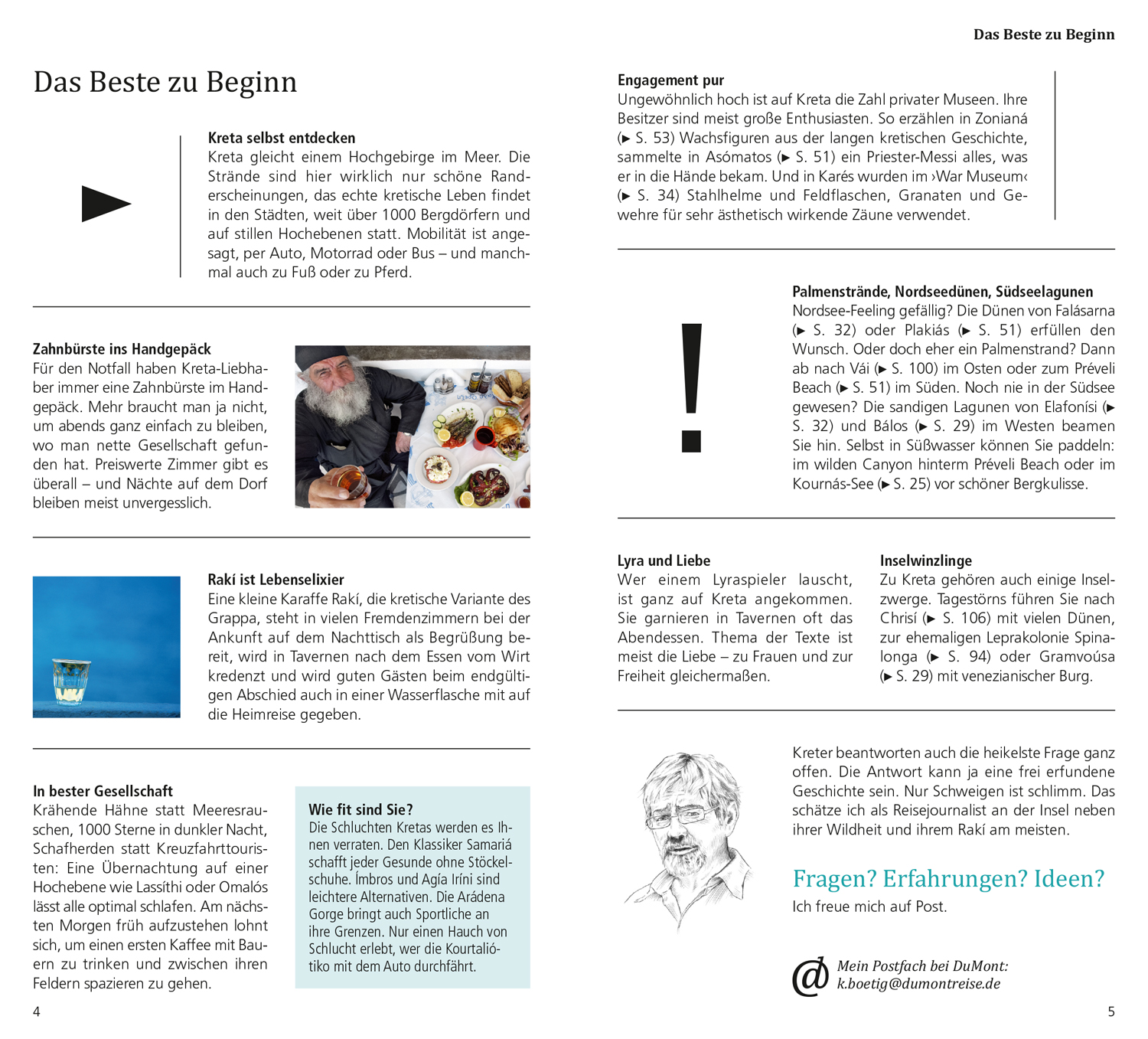 Das Beste zu Beginn. Das ist Kreta. Kreta in Zahlen. So schmeckt Kreta. Ihr Kreta-Kompass: Chaniá und der "Wilde Westen", Réthimno und der mittlere Westen, Iráklio und Zentralkreta sowie Ágios Nikólaos und der Inselosten. Hin & Weg. O-Ton Kreta. Kennen Sie die?