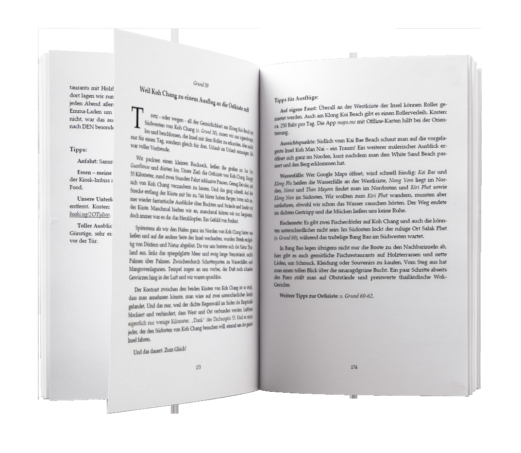Jedes Kapitel ist eine Kombination aus Erfahrungsbericht und Insidertipps. Es steckt voller Gefühl und bietet gleichzeitig praktisches Futter für deine Backpacking-Reise, vor allem abseits der Standardrouten. Diese Hochburgen wirst du z. B. nicht finden: Pattaya, Koh Phi Phi, Phuket, Koh Samui.