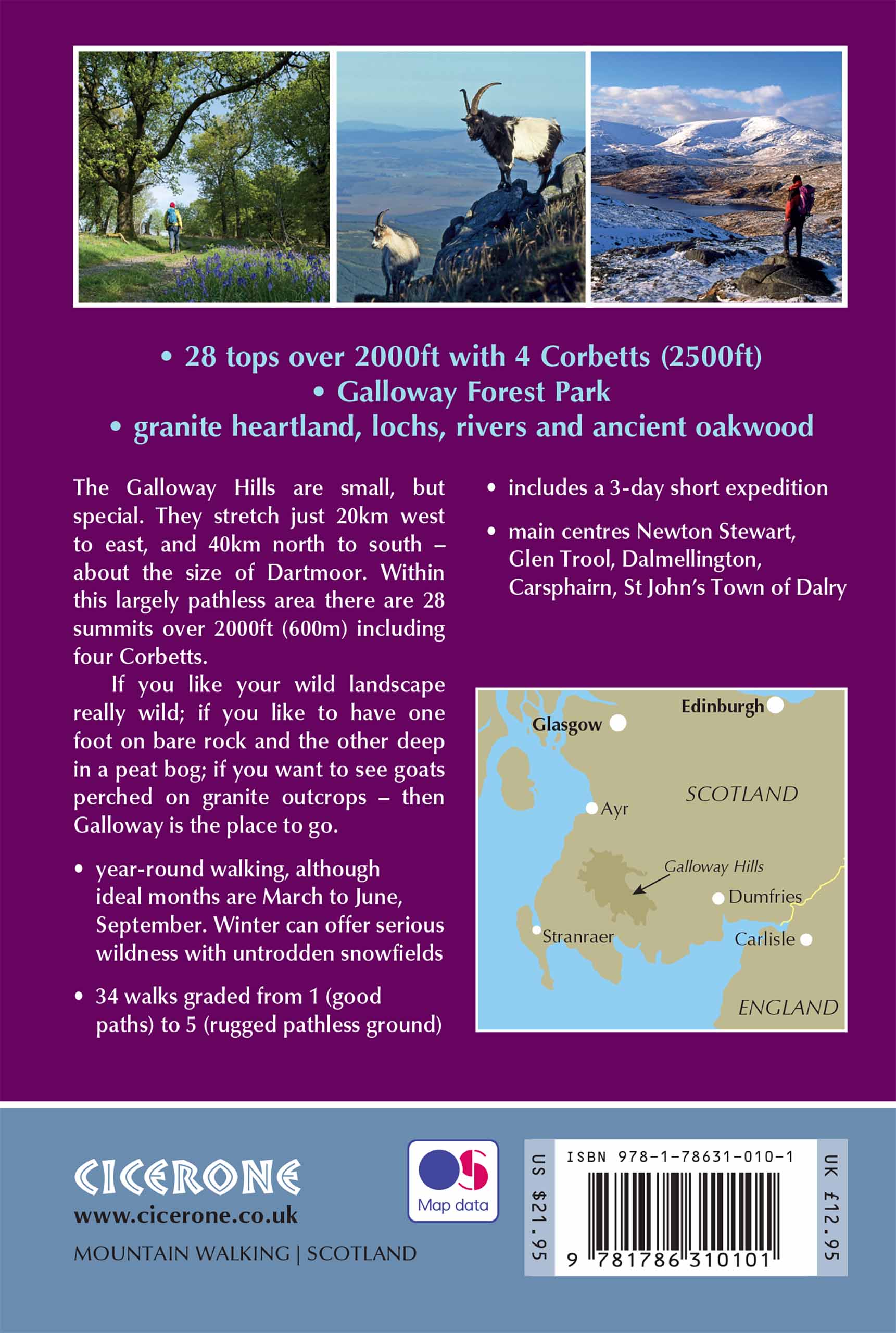 Map key Overview map Introduction Harshness and heather Geology of the Galloway Hills Wildlife and wet Free Forest of Buchan Forest park and biosphere Climbing and scrambling When to walk Getting here, getting around, staying the night Maps and GPS Safety in the hills Using this book Section 1: Glen Trool Route 1 Water of Minnoch and Glen Trool Route 2 Water of Trool Route 3 Around Loch Trool Route 4 Fell of Eschoncan to Bennan Route 5 Merrick and Rig of the Buchan Route 6 The Three Lochs Route 7 Craignaw Route 8 Craiglee and Rig of the Jarkness Route 9 Mulldonoch to Curleywee Route 10 Caldron of the Merrick Section 2: The Awful Hand Route 11 Kirriereoch Hill and Merrick Route 12 The Awful Hand: Shalloch to Benyellary Route 13 Shalloch on Minnoch Route 14 Craigmasheenie and Shiel Hill Section 3: Loch Doon Route 15 Craiglee of Doon Route 16 Hoodens Hill and Mullwharchar Route 17 Northern Rhinns of Kells from Loch Doon Section 4: The Glenkens Route 18 Garryhorn and the northern Rhinns of Kells Route 19 Cairnsmore of Carsphairn Route 20 Craig of Knockgray Route 21 Corserine from Forrest Lodge Route 22 Southern Rhinns of Kells Route 23 Mulloch Hill Route 24 Waterside Hill Route 25 Dunveoch Section 5: Talnotry and the south Route 26 Larg Hill to Curleywee Route 27 Curleywee by Stronbae Hill Route 28 Millfore Route 29 Cairnsmore of Fleet from the north Route 30 Cairnsmore of Fleet from the south Route 31 Clints of Dromore Route 32 Knockman Wood Route 33 The Thieves Stones Route 34 Wood of Cree Section 6: Expeditions Route 35 Not the Southern Upland Way Other routes Appendix A Route summary table Appendix B The bothies Appendix C Information points