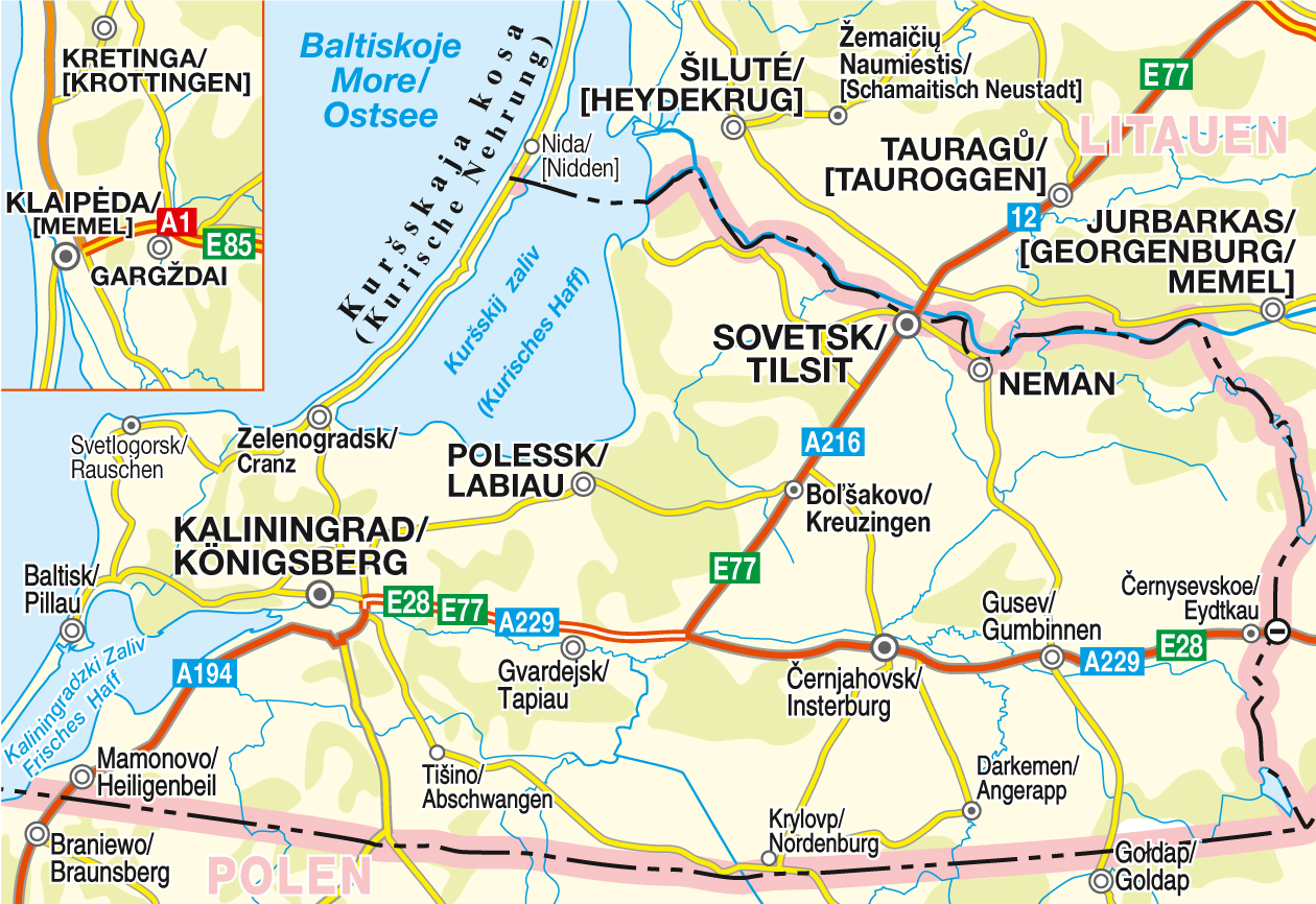 | Schlagworte | Föderation • Gumbinnen • Insterburg • Königsberg • Memel • Memelland • Nördliches Ostpreussen • Ostpreußen; Autokarte/Straßenkarte • Ostpreußen, Karte; Autokarte/Straßenkarte • Ostpreußen; Karten • Russische Föderation • Russland • Tilsit |