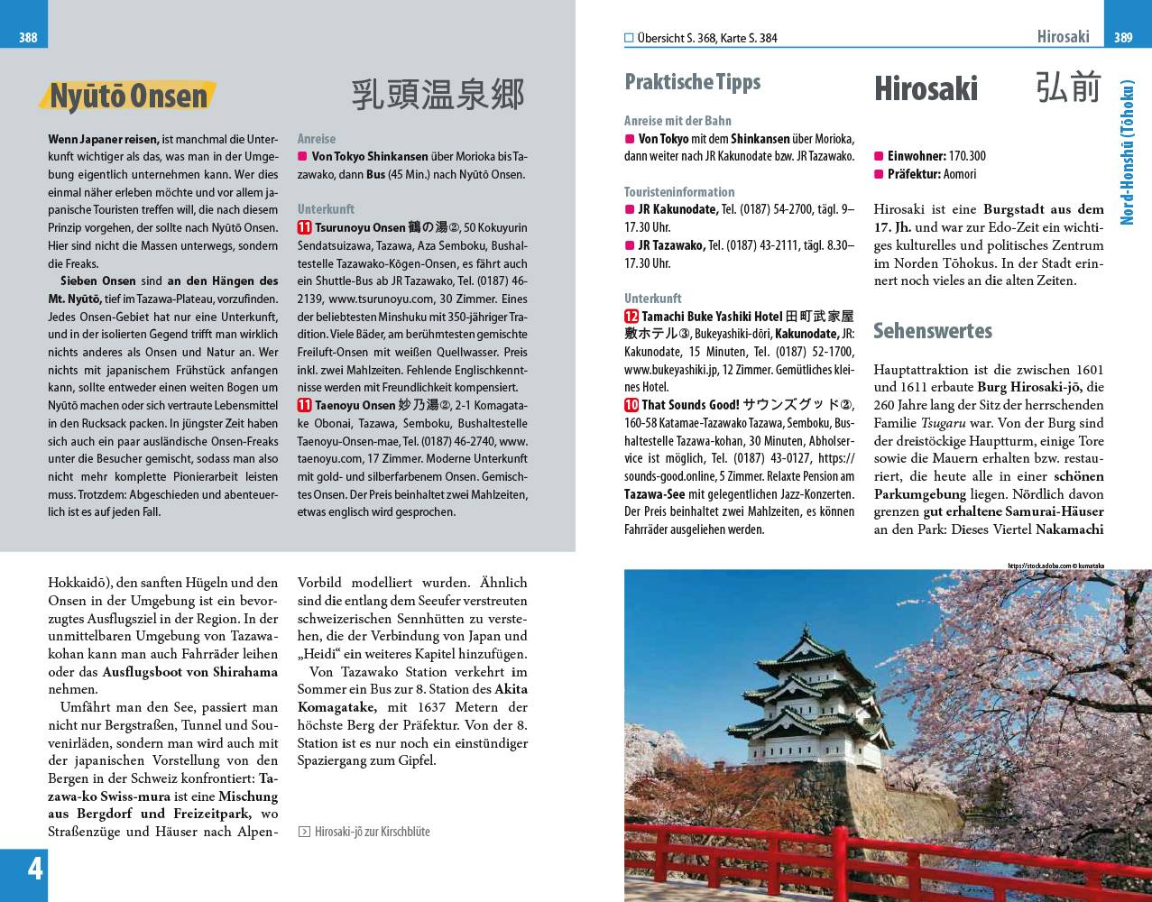 Jedes Kapitel des Reiseführers beginnt mit einer Doppelseite, auf der die Inhalte mit einer Übersichtskarte der Region, Highlights und Seitenverweisen vorgestellt werden. Farblich auf die Kapitel abgestimmte Seitenzahlkästchen erleichtern die Orientierung im Buch. Natürlich enthält der Reiseführer die bewährten und praktischen Tipps zu Reisefragen von A-Z, z.B. zu Unterkunftsempfehlungen für jeden Geldbeutel - Hotels, Ryokan, Pensionen oder Jugendherbergen. Viele Exkurse zu interessanten Themen rund um Japan und eine kleine Sprachhilfe Japanisch machen diesen aktuellen Reiseführer zu einem unentbehrlichen Begleiter.