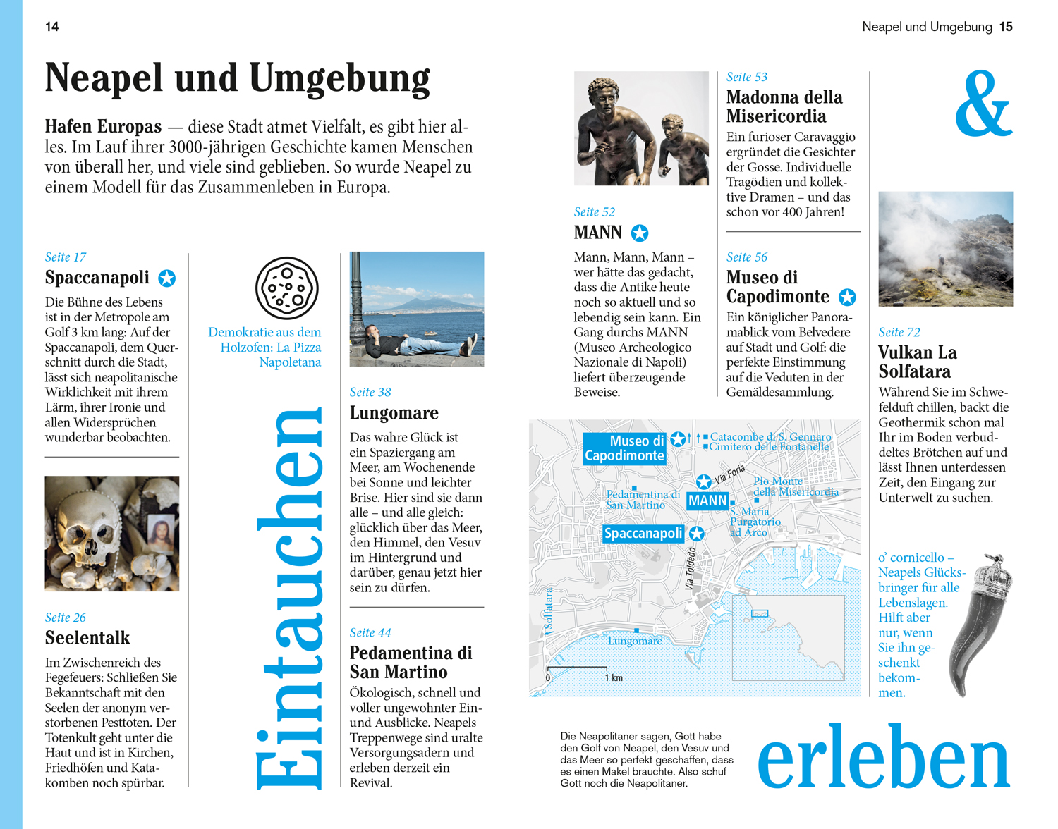 Senkrechtstarter, Überflieger, Querfeldein. Vor Ort - die Kapitel: Neapel und Umgebung, Im Golf von Neapel, Ischia, Procida und Capri, Die Amalfiküste, Der Cilento. Das Kleingedruckte (Reiseinfos von A bis Z). Das Magazin. Offene Fragen.