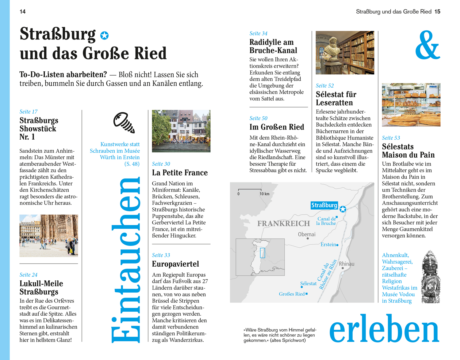 Senkrechtstarter, Überflieger, Querfeldein. Vor Ort - die Kapitel: Straßburg und das Große Ried, Nordelsass, Elsässische Weinstraße, Colmar und die Rheinebene, Vogesen, Mulhouse und der Sundgau. Das Kleingedruckte (Reiseinfos von A bis Z). Das Magazin. Offene Fragen.