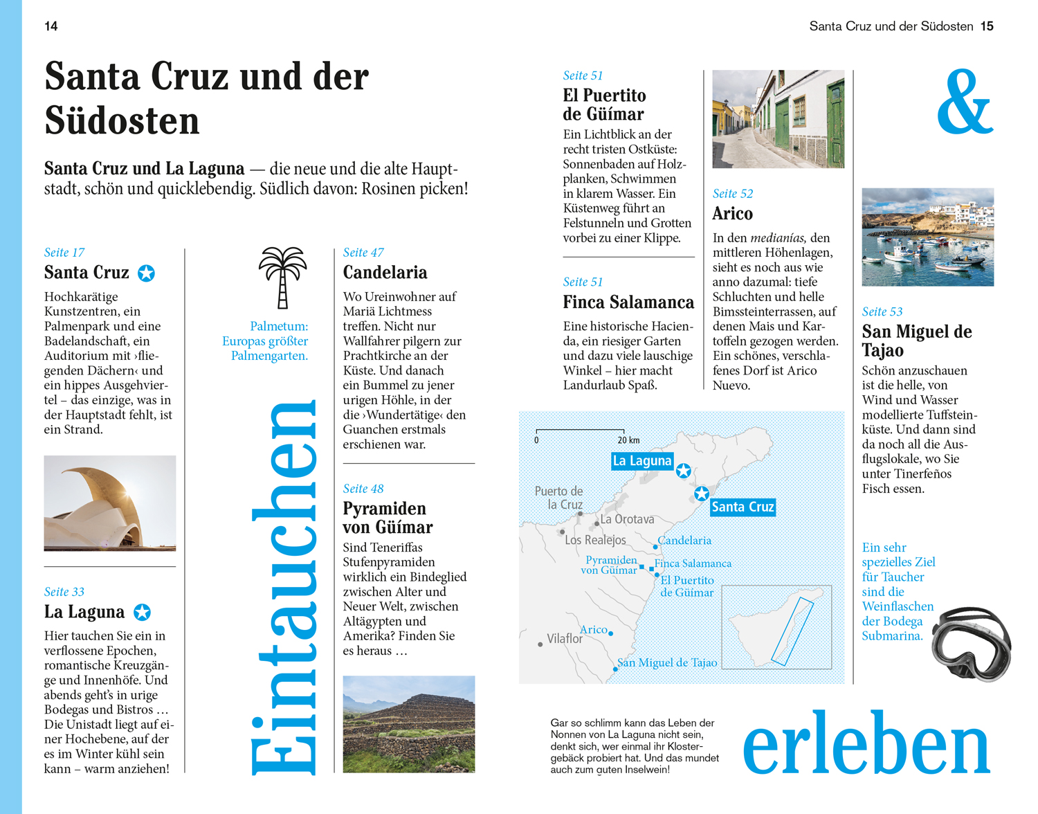 Senkrechtstarter, Überflieger, Querfeldein. Vor Ort - die Kapitel: Santa Cruz und der Südosten, Die Südküste, Südliches Bergland, Der Nordwesten, Valle de Orotava, Der Nordosten, Das Inselzentrum. Das Kleingedruckte (Reiseinfos von A bis Z). Das Magazin. Offene Fragen.