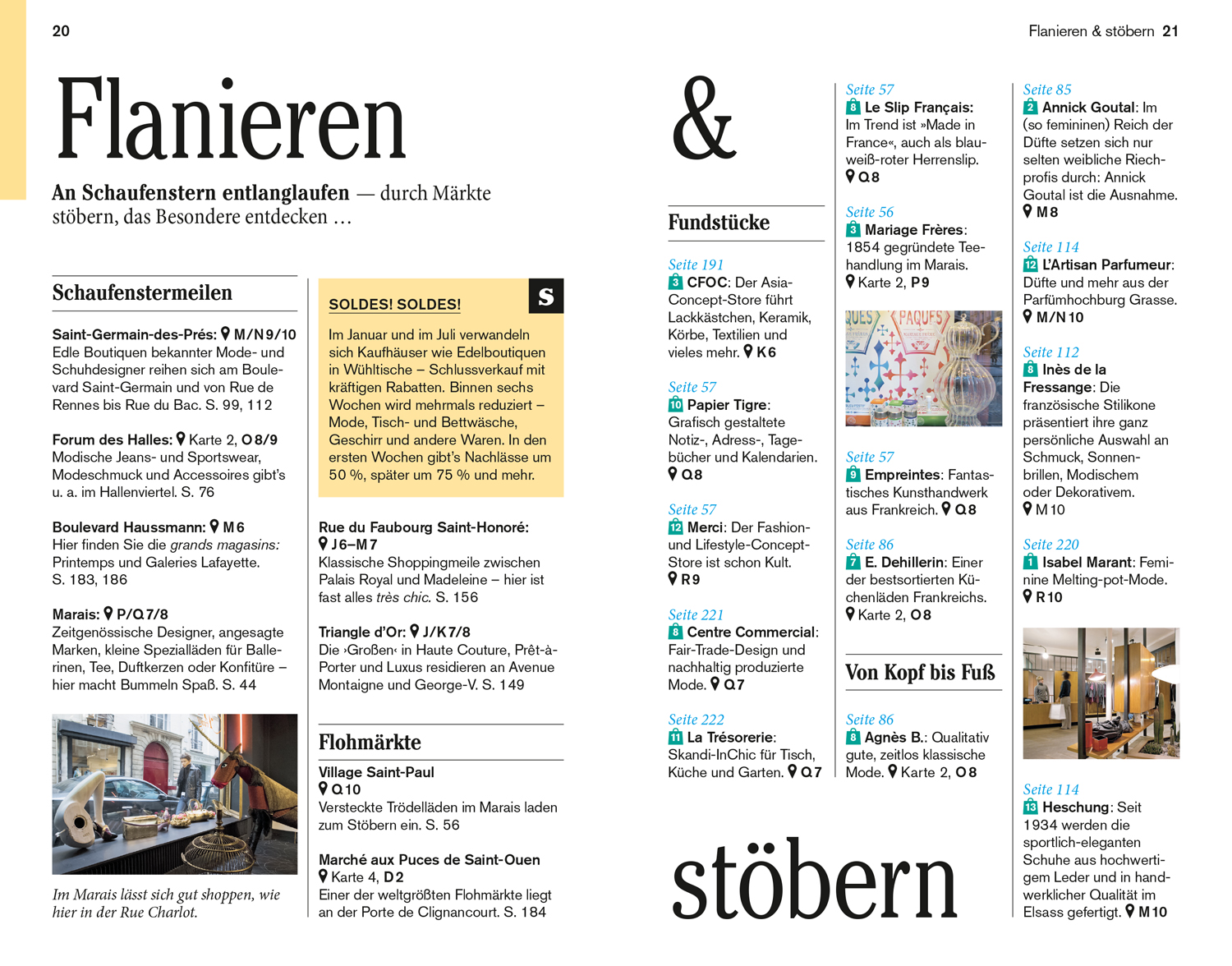 Vor Ort - die Stadtviertel samt persönlichen Adresstipps: Seine-Inseln und Marais, Louvre, Sentier und Les Halles, Saint-Germain und Montparnasse, Quartier Latin, Bercy und Tolbiac, Eiffelturm, Trocadéro und Champs-Élysées, Montmartre, SoPi und Opéra, Bastille, La Villette und der Nordosten, Ausflüge.