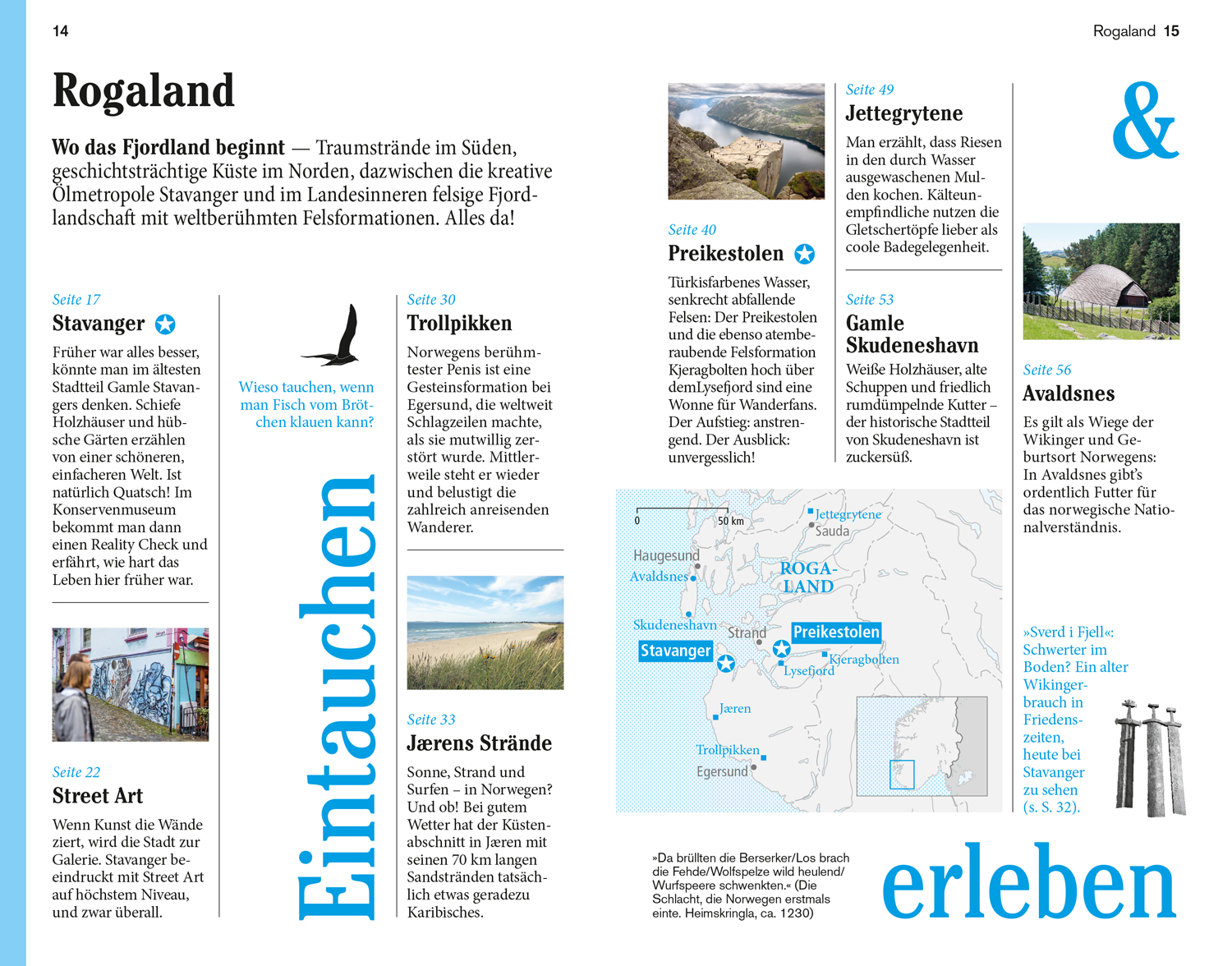 Senkrechtstarter, Überflieger, Querfeldein. Vor Ort - die Kapitel: Rogaland, Hordaland, Sognefjord, Die Küste von Sogn og Fjordane und der Nordfjord, Møre og Romsdal. Das Kleingedruckte (Reiseinfos von A bis Z). Das Magazin. Offene Fragen.