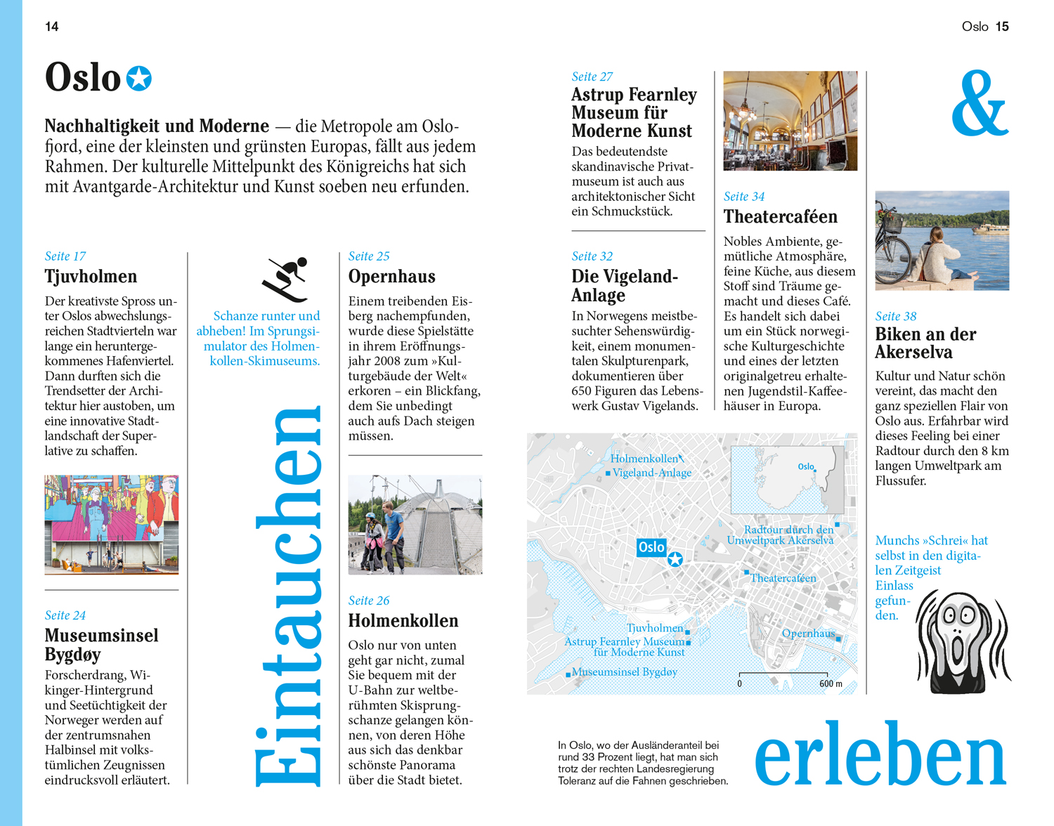 Auf 312 Seiten beschreiben Michael Möbius und Annette Ster den norwegischen Süden samt der Hauptstadt Oslo. Sie begleiten uns in ihrer Wahlheimat durch Stadt und Land, Kultur und Natur und führen mitten hinein in den norwegischen Alltag. Mit 23 Touren – zu Fuß oder mit dem Rad, per Boot, Bus, Bahn oder Auto –, persönlichen Lieblingsorten, ausgewählten Adressen und besonderen Autorentipps. Das Magazin mit Interviews, Porträts, Reportagen und Fotos schafft eine spürbare Nähe zur Lebenswelt in Norwegen. Eine Übersichtskarte mit den Highlights, 27 Citypläne und Tourenkarten sowie die große separate Reisekarte unterstützen die Orientierung, und als Online-Zugabe sind aktuelle Reisetipps und News der Autoren abrufbar.