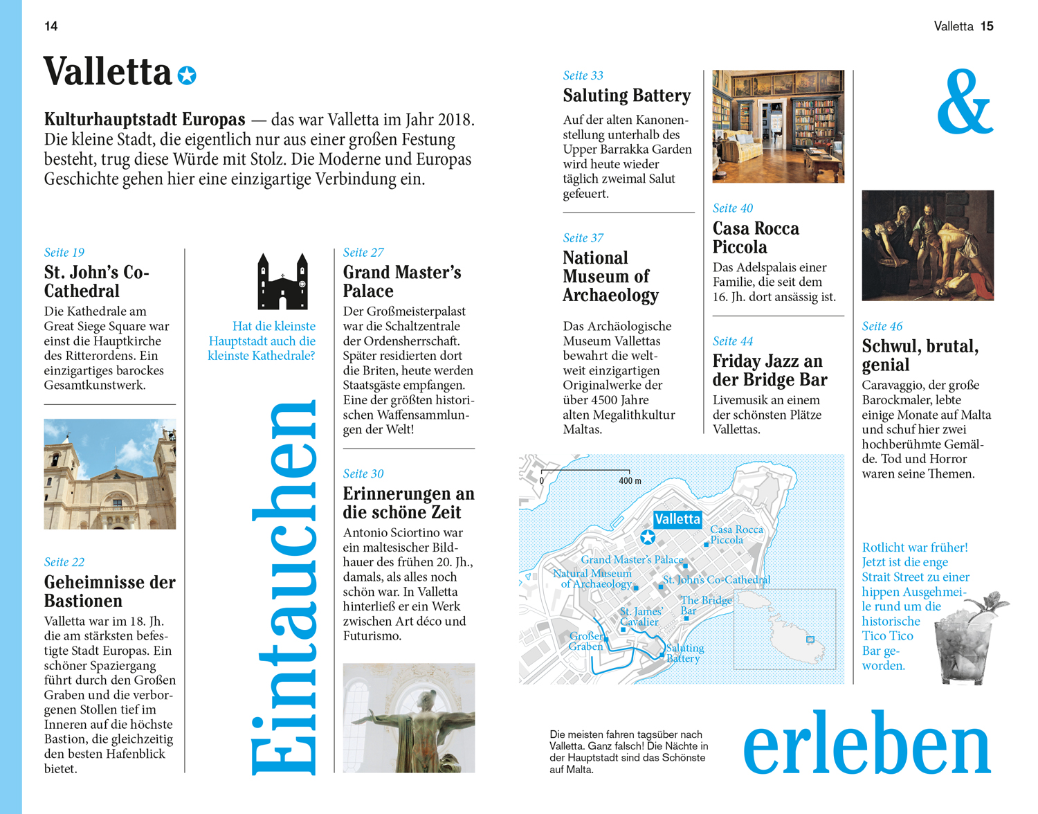 Senkrechtstarter, Überflieger, Querfeldein. Vor Ort - die Kapitel: Valletta, Sliema und San Giljan, Am Grand Harbour, An der Marsaxlokk Bay, Zentralmalta, Der Norden Maltas. Das Kleingedruckte (Reiseinfos von A bis Z). Das Magazin. Offene Fragen.