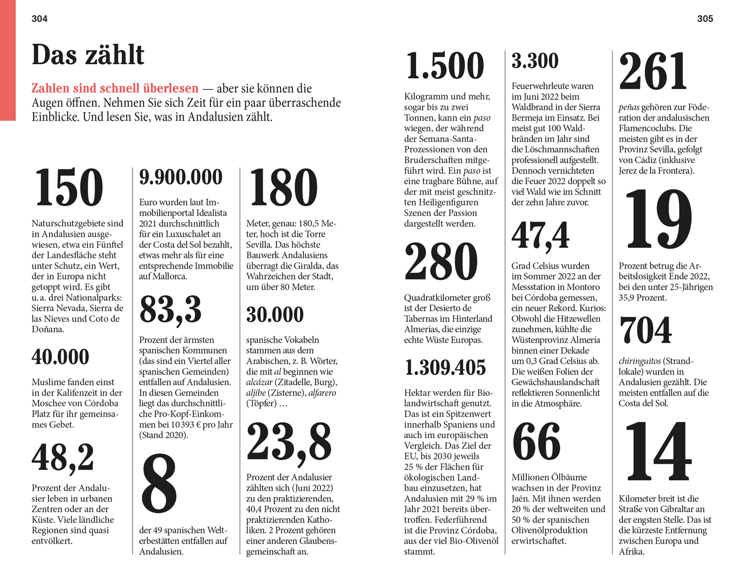 Senkrechtstarter, Überflieger, Querfeldein. Vor Ort – die Kapitel: Málaga, Costa del Sol und Hinterland, Die Atlantikküste, Sevilla und Umgebung, Córdoba und der Nordosten, Der Südosten – Granada und Almería. Das Kleingedruckte (Reiseinfos von A bis Z). Das Magazin. Offene Fragen.