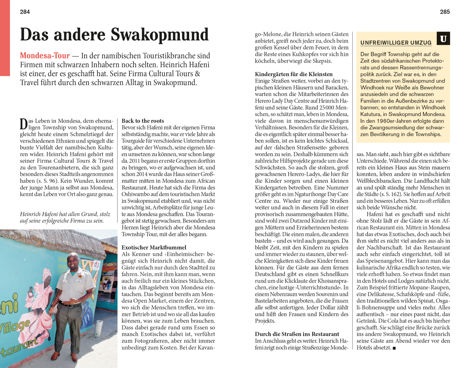 Auf 304 Seiten beschreibt Axel Scheibe das Land aus Steinen und Sand. Sein Buch begleitet durch Natur und Kultur, Stadt und Land, ans Meer und in die Berge. Er führt mitten hinein in den Alltag und das Leben vor Ort. Mit 20 Touren, persönlichen Lieblingsorten, ausgewählten Adressen und besonderen Autorentipps. Das Magazin mit Essays, Porträts, Reportagen und Fotos schafft eine spürbare Nähe zur Lebenswelt in Namibia. 4 Citypläne und 20 Tourenkarten sowie die große separate Reisekarte unterstützen die Orientierung, und als Online-Zugabe gibt‘s aktuelle Reisetipps und News des Autors.