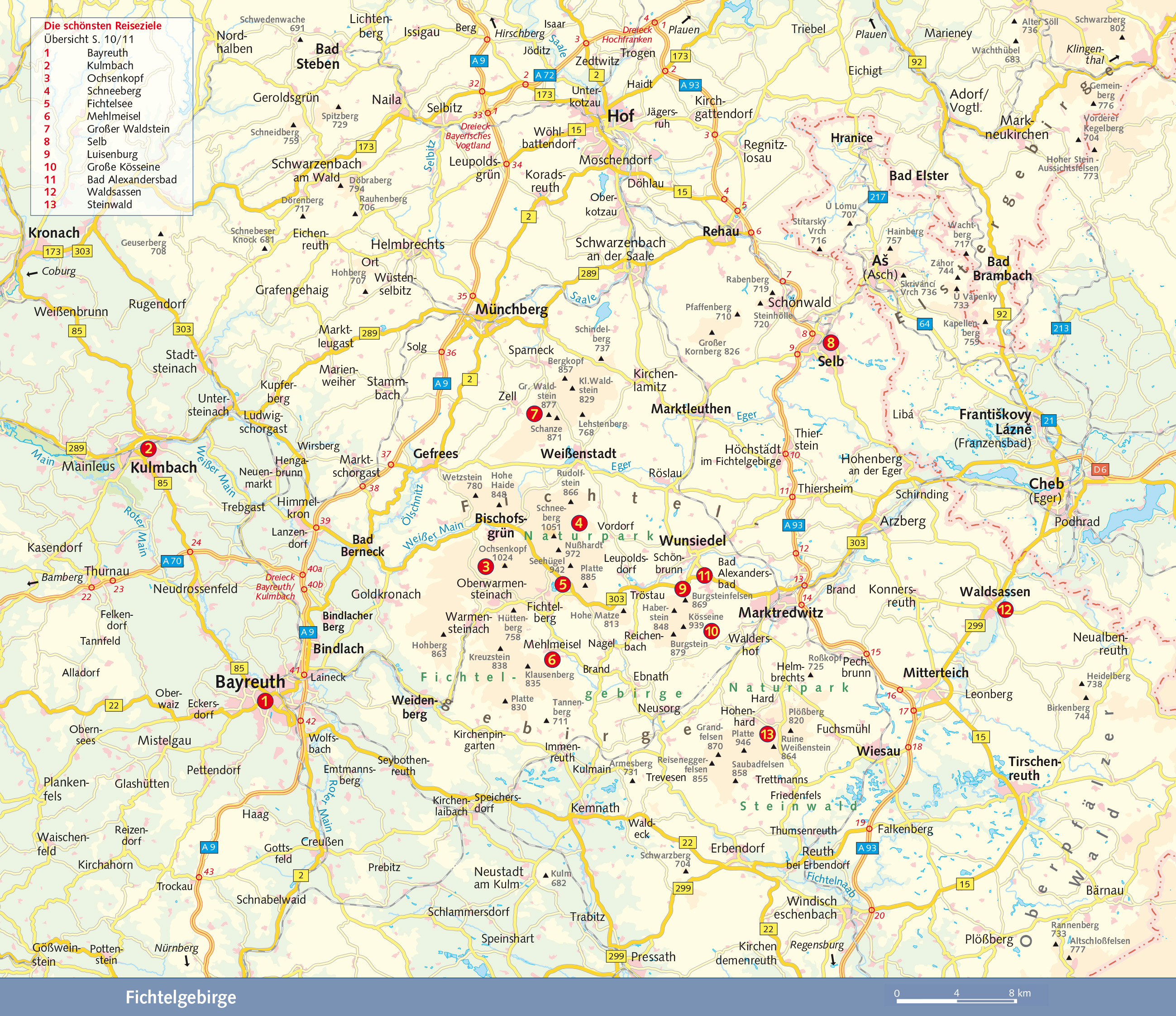 Willkommen im Fichtelgebirge 9Die schönsten Reiseziele 10Aus alten literarischen Zeugnissen 12LAND UND LEUTE 15Kleine Geografie 16Das Gebirge 17Die Gewässer 17Gesteine und Mineralien 20Klima und Wetter 24Die Pflanzenwelt 25Die Tierwelt 27Geschichte in Stichworten 29Kultur, Bevölkerung und Mundart 31Kunstgeschichtlicher Streifzug 32Essen und Trinken 37Berühmte Leute 40Wirtschaft gestern und heute 41REISEZIELE IM FICHTELGEBIRGE 45Das Bayreuther Vorland 46Bayreuth 46Bindlach 63Bad Berneck 63Marktschorgast 66Stammbach 68Wirsberg 68Himmelkron 71Trebgast 72Kulmbach 73Neudrossenfeld 78Um Ochsenkopf und Schneeberg 79Ochsenkopf 79Schneebergkette 81Bischofsgrün 84Fichtelberg 87Mehlmeisel 90Warmensteinach 91Weidenberg 94Goldkronach 96Vom Waldstein zum Kornberg 99Der Große Waldstein 99Der Epprechtstein 101Der Große Kornberg 101Münchberg 102Sparneck 104Schwarzenbach an der Saale 105Schönwald 108Marktleuthen 110Das Rondell bei Kaiserhammer 111Kirchenlamitz 112Weißenstadt 113Gefrees 116Zell 118Im Bayerischen Vogtland 120Hof 120Rehau 127Oberkotzau 129Das Grenzland an der Eger 131Selb 132Asch (A?) 135Hohenberg an der Eger 136Schirnding 138Eger (Cheb) 139Franzensbad (Franti?kovy Lázn?) 140Waldsassen 141Arzberg 144Rund um die Kösseine 146Die Luisenburg 146Der Burgsteinfelsen 149Der Haberstein 150Die Kösseine 150Wunsiedel 151Röslau 157Höchstädt 158Thierstein 158Thiersheim 160Marktredwitz 161Ebnath 165Brand/Oberpfalz 166Nagel 167Tröstau 168Bad Alexandersbad 170Durch den Steinwald 173Waldershof 173Friedenfels 175Fuchsmühl 177Wiesau 180Erbendorf 181Kemnath 183Immenreuth 186Neusorg 187REISETIPPS 189Auskünfte 189Verkehr 189Grenzübergänge 191Unterkunft 191Ferienorte mit Prädikat 193Naturschutzgebiete 193Hauptberge und Aussichtspunkte 194Museen und Sammlungen 194Naturpark-Infostellen 196Gärten und Parks 196Besucherbergwerke 197Veranstaltungskalender 197Wandern im Fichtelgebirge 198Rundwanderungen für Autofahrer 201Radtouren durch die Region 204Hobby und Sport 207Literatur 208Der Autor 208Ortsregister 209EXTRAGoethe im Fichtelgebirge 23Markgräfin Wilhelmine 36Kartoffeln aus Pilgramsreuth 39Der Komponist Richard Wagner 49Freimaurermuseum Bayreuth 57Auf den Spuren von Jean Paul 62Die Schiefe Ebene 70Oberbergmeister von Humboldt 98Biographische Belustigungen unter der Gehirnschale einer Riesin 126Das alte Sechsämterland 156Die Fuchsmühler Holzschlacht 179>>> Weitere Reiseführer zu interessanten Regionen in Deutschland: www.trescher-verlag.de