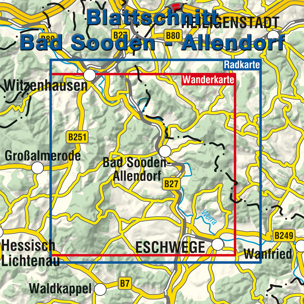 Die neue Ausgabe der Rad- und Wanderkarte mit Stadtplan Bad Sooden-Allendorf stellt auf der Vorderseite die Wanderregion von Witzenhausen über den Hohen Meißnern bis Bad Sooden-Allendorf und Eschwege im detaillierten Maßstab mit dem vollständigen Wanderwegenetz vor. Eine Radkarte im Maßstab 1:50 000 stellt auf der Rückseite der Karte das umfangreiche Radwegenetz sowie die Mountainbiketouren der Region dar. Durch die getrennte Darstellung der Wanderwege und Radwege erscheint die Kartographie übersichtlicher und dem Nutzer wird die Orientierung erleichtert. Ein Stadtplan von Bad Sooden-Allendorf mit den Nordic-Walking-Strecken rundet das Angebot ab.