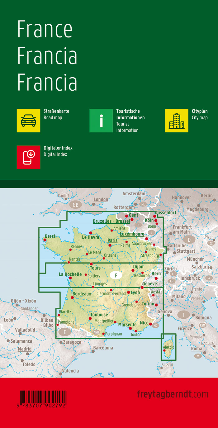 Mit der Straßenkarte Frankreich im Maßstab 1:800.000 finden sich Urlauber die mit Auto, Motorrad oder Wohnwagen unterwegs sind bestens zurecht. Das weit verzweigte Straßennetz ist exakt abgebildet, Entfernungen und viele Ausflugsziele sind in der Karte eingezeichnet.