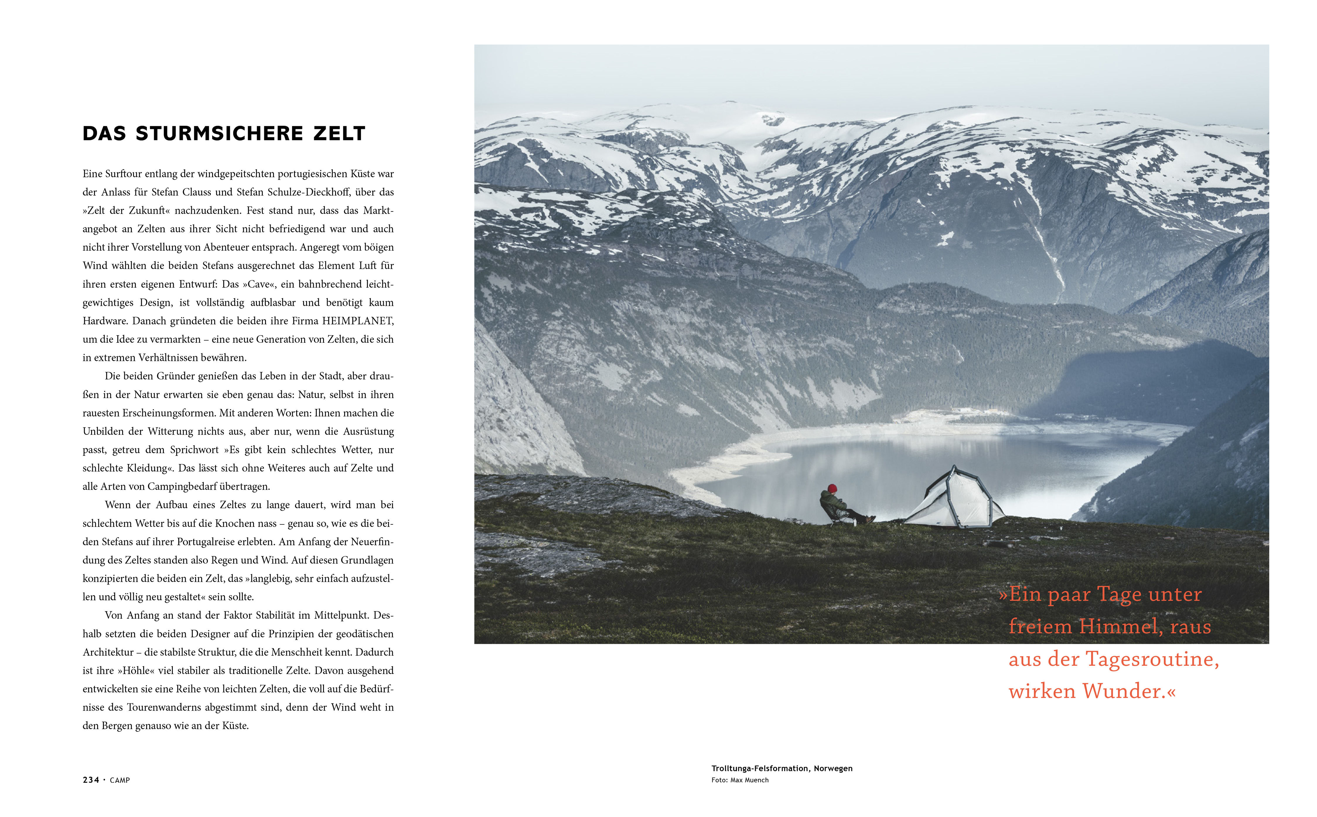 Dieser inspirierende Bildband erzählt vom Campen in allen seinen Facetten: mit Tipps für die richtige Planung und Ausstattung, Survival-Guides für Nächte im Freien und Reiseberichten von den schönsten Camping-Touren weltweit - vom Wochenende am schwedischen See bis zu mehrtägigen Expeditionen in die verschneiten Weiten Lapplands oder Übernachtungen am senkrechten Felshang. Schwelgerisch bebildert, hält das Buch jede Menge Inspiration und Reisetipps bereit, für Outdoor-Profis ebenso wie für weniger geübte Abenteurer. Denn Wildnis kann auch das bislang unbeachtete Waldstück vor der eigenen Haustür sein.