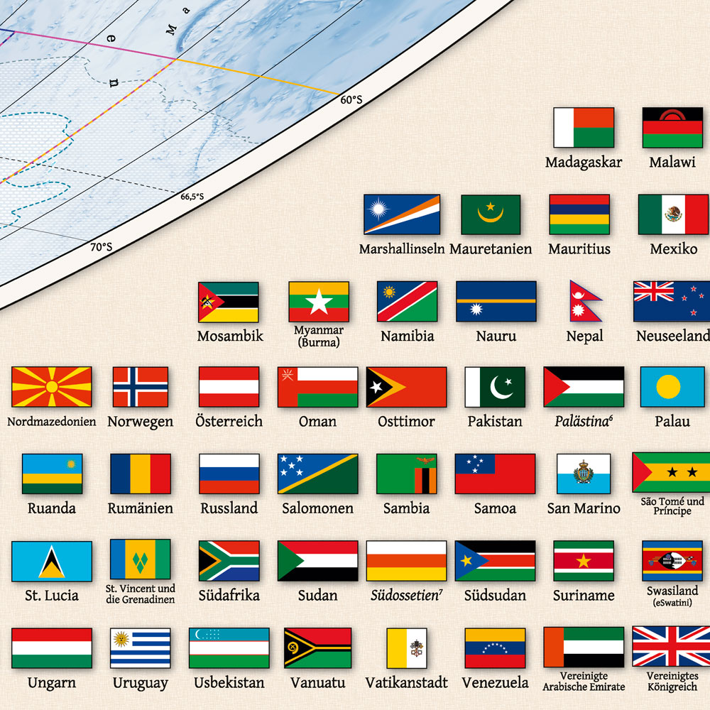 Außerdem sind auf der Karte die Nationalflaggen aller 194 von den Vereinten Nationen anerkannten souveränen Staaten und zusätzlich die Flaggen nicht vollständig anerkannter Staaten abgebildet.