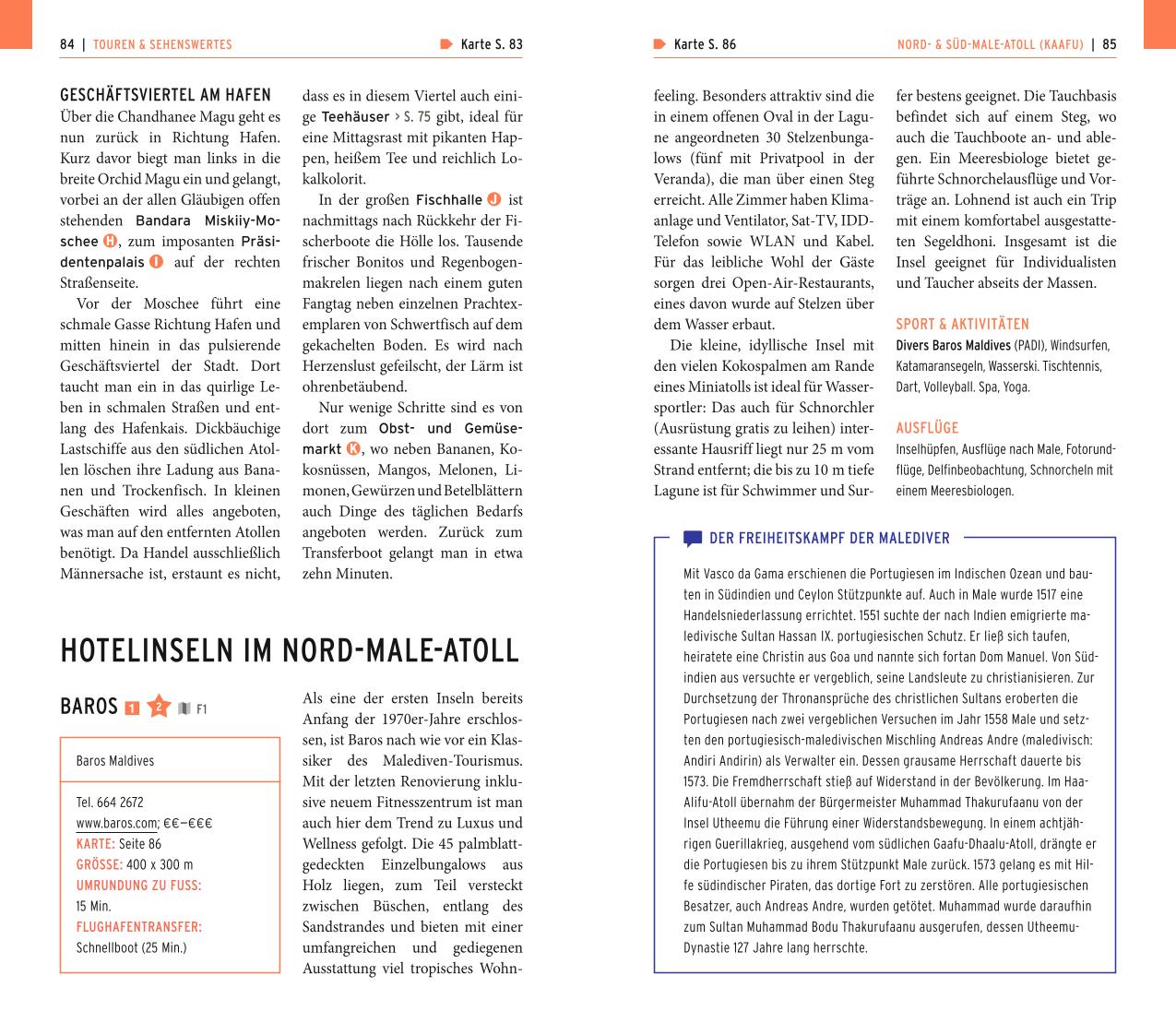 Mit dem POLYGLOTT on tour Malediven lässt sich der Herzschlag des Archipels erspüren. Der Autor Wolfgang Rössig führt in ausgeklügelten Touren über die Vielseitigkeit der Inseln und lässt Sie Typisches, Besonderes und Eigenheiten entdecken. Lernen Sie die Malediven hautnah kennen. Schnorcheln Sie auf Baros oder Diven Sie vor Embudhu, Picknicken Sie allein auf einer unbewohnten Insel oder bewundern Sie das geheimnisvolle Meeresleuchten... Sicher können Sie sich dem Flair des Inselstaates bald nicht mehr entziehen. Dank individueller Tipps können Sie ausprobieren und eintauchen, mitten hinein ins tropische Inselleben.