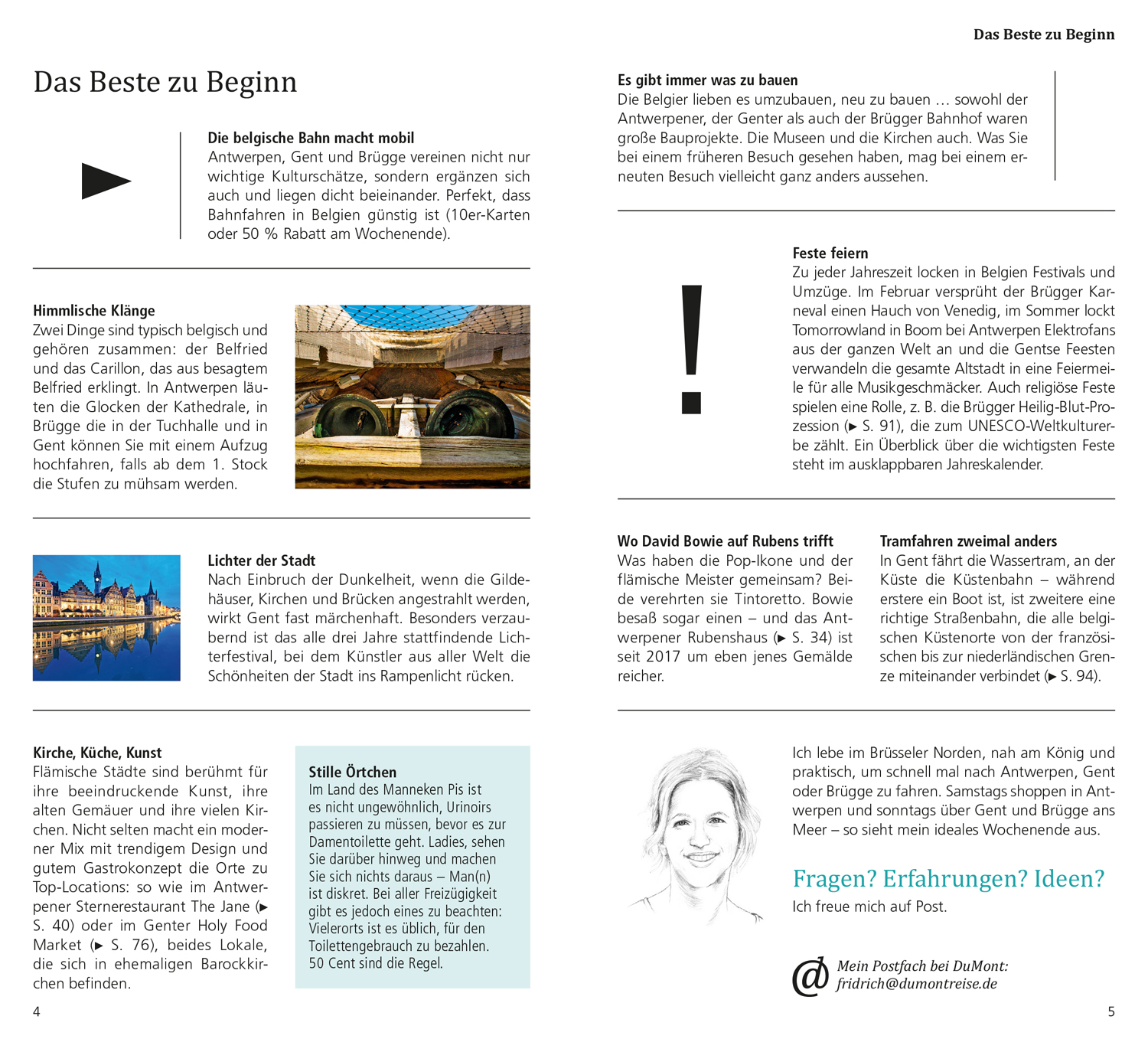 Das Beste zu Beginn. Das sind Antwerpen, Gent, Brügge. Antwerpen, Gent, Brügge in Zahlen. Ihr Kompass: 15 Direktkapitel. Museumslandschaften. Rubens inspiriert den Antwerpener Barock. Genter Märkte. Bier, Pommes und Pralinen. Pause - Einfach mal abschalten. Adressen: In fremden Betten, Satt & glücklich, Stöbern & entdecken, Wenn die Nacht beginnt. Hin & weg. O-Ton Antwerpen. Kennen Sie die?