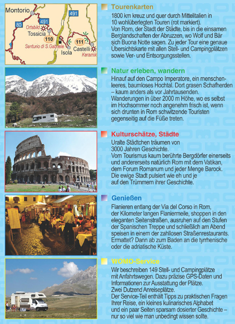 1800 km kreuz und quer durch Mittelitalien in 10 wohlüberlegten Touren (rot markiert). Von Rom, der Stadt der Städte, bis in die einsamen Berglandschaften der Abruzzen, wo Wolf und Bär sich Buona Notte sagen. Zu jeder Tour eine genaue Übersichtskarte mit allen Stell- und Campingplätzen sowie Ver- und Entsorgungsstellen.