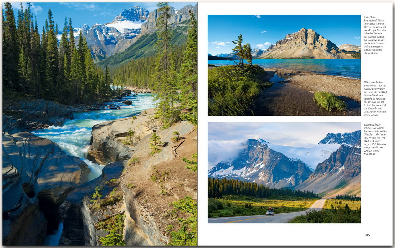 Über 365 Bilder zeigen Kanada von Vancouver an der Küste des Pazifiks über die Rocky Mountains und goldenen Prärien bis an die Klippen Newfoundlands im Atlantik in all seinen Facetten. Sechs Specials berichten über die geheimnisvollen Totempfähle, die Zeit des Goldrausches, die legendären Canadian-Pacific-Hotels, die Zeitreise in die glanzvolle Vergangenheit von Louisbourg, über Eisbären und die von der Religion bestimmte Lebensweise der Mennoniten.