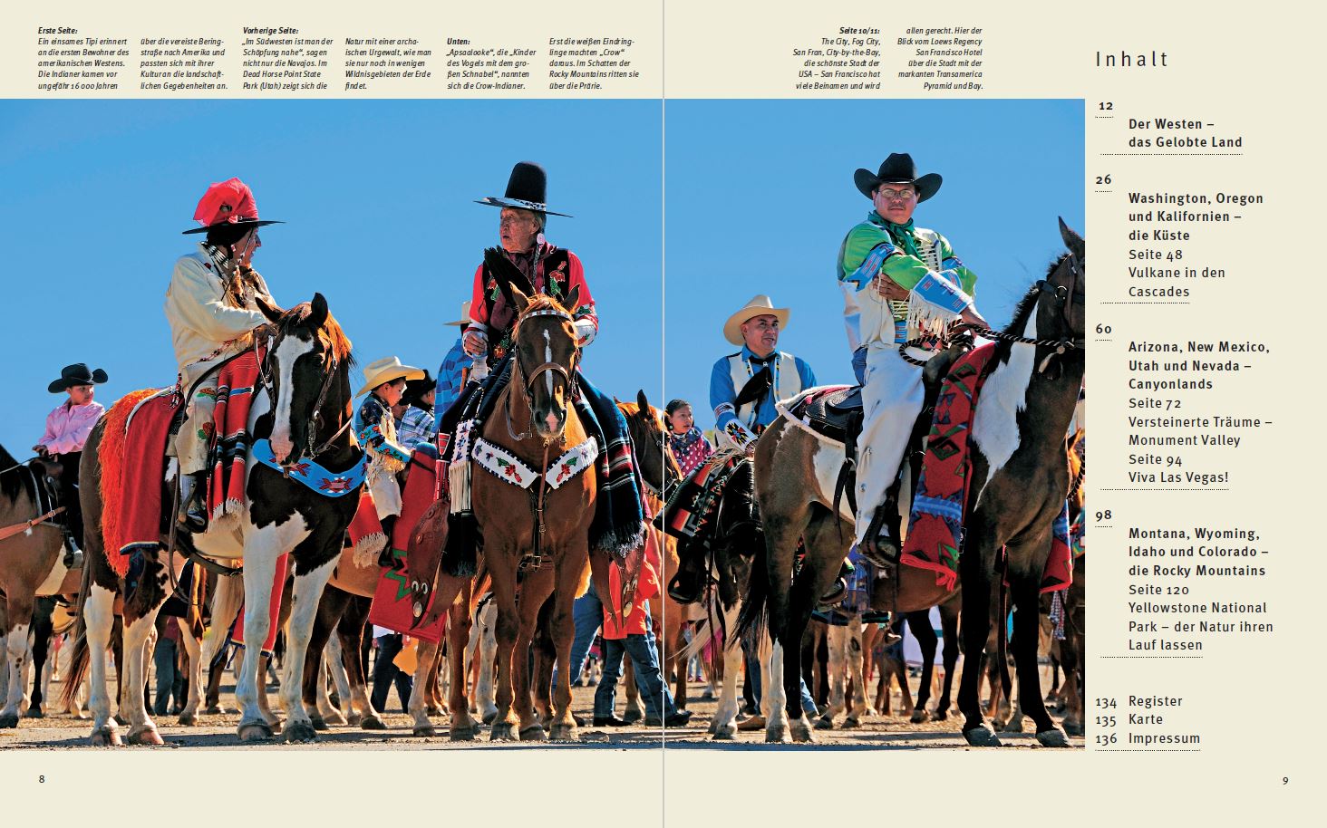 Der Südwesten der USA ist geprägt von den "desert states" Arizona, New Mexico, Nevada und Utah, die "empty landscapes" ziehen Reisende und Künstler gleichermaßen an. Leuchtend rote Felsnadeln und mächtige Tafelberge, grandiose Schluchten, allen voran der Grand Canyon, grüne Fichtenwälder und strahlend blauer Himmel bilden geradezu mythische Ansichten. Kalifornien, der Sunshine State, bietet faszinierende Großstadtimpressionen in den Metropolen San Francisco und Los Angeles. Aus dem Pazifik im Westen steigen dramatisch die Coast Mountains auf, dahinter werden breite Täler mit fruchtbaren Böden abgelöst von heiß-kargen Wüstenbecken wie dem Death Valley.