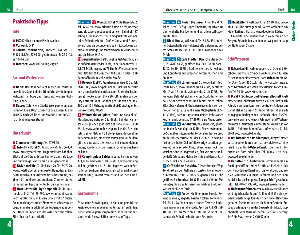 Jedes Kapitel beginnt mit einer Doppelseite, auf der die Inhalte mit einer Übersichtskarte der Region, Highlights und Seitenverweisen vorgestellt werden. Natürlich enthält der Reiseführer die bewährten und praktischen Tipps zu Reisefragen von A-Z. Im erweiterten Vorspann finden sich Übersichtsseiten mit Beschreibungen aller Regionen, eine Jahresübersicht zu Festen und Veranstaltungen, Routenvorschläge und persönliche Top-Tipps des Autor. Viele spezielle Infos, beispielsweise zur Anreise und zu den vielfältigen Möglichkeiten an Aktivitäten, sind hilfreiche Planungshelfer. Ein kleine Sprachhilfe Plattdüütsch gibt einen Einblick in das "echte Norddeutsch".