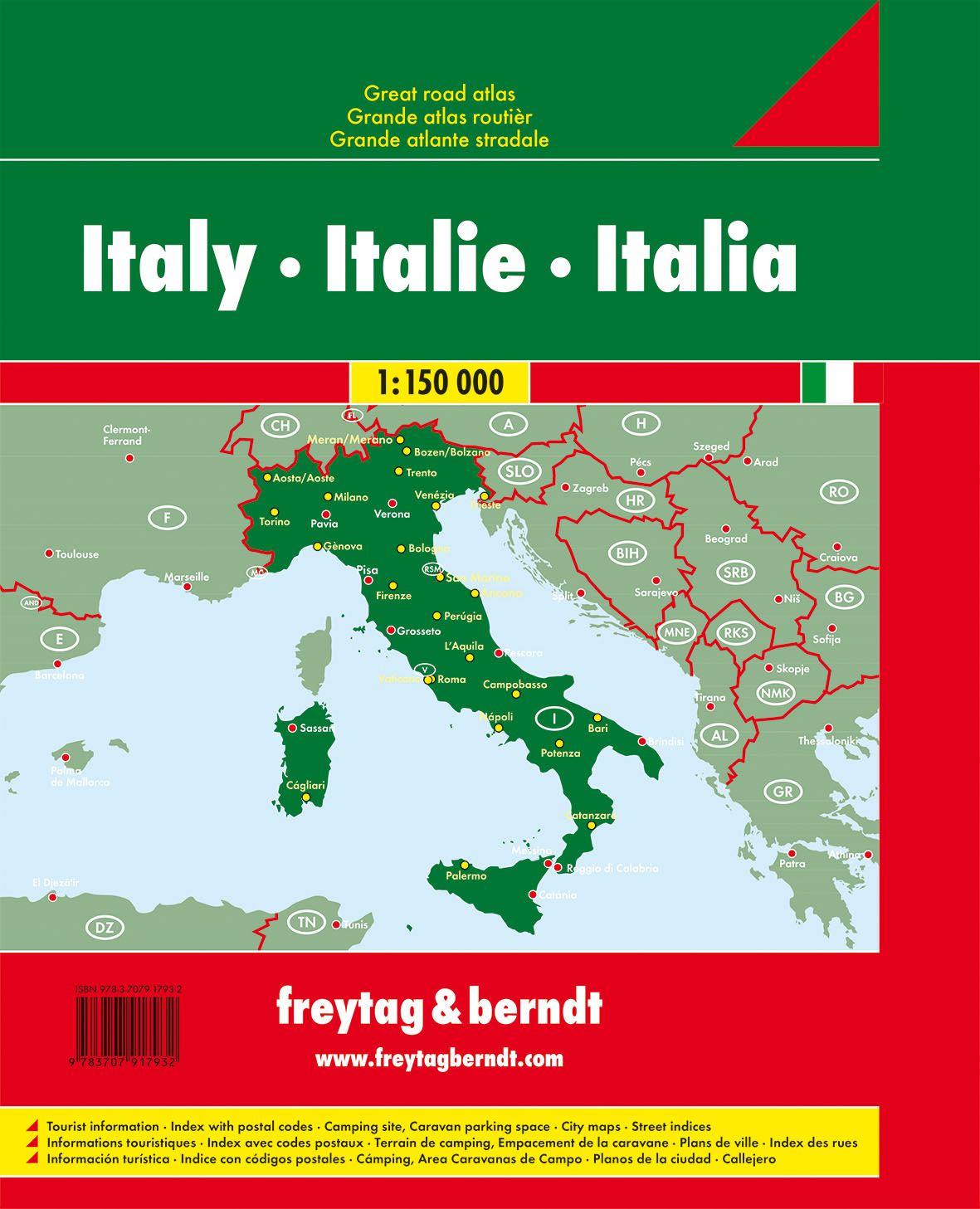 Details: Touristische Informationen, Ortsregister mit Postleitzahlen, Campingplatz, Wohnwagen Stellplatz, Citypläne von Ancona, Aosta, Bari, Bologna, Bozen, Cágliari, Campobasso, Catanzaro, Florenz, Genua, L'Aquila, Meran, Mailand, Neapel, Palermo, Perúgia, Potenza, Rom, Turin, Trento, Triest, Venedig, Vatikan, San Marino, Straßenverzeichnis