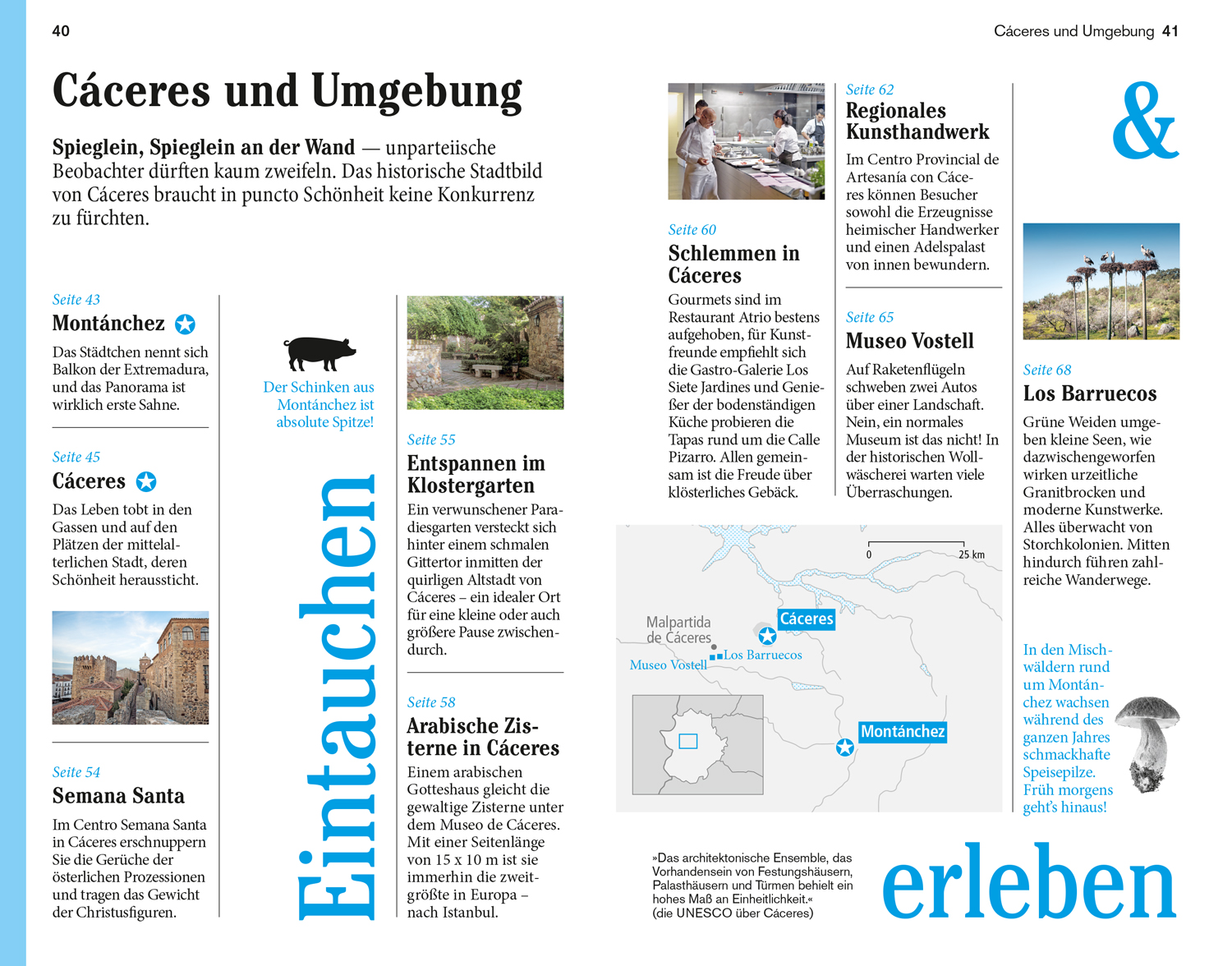 Senkrechtstarter, Überflieger, Querfeldein. Vor Ort - die Kapitel: Mérida und Umgebung, Cáceres und Umgebung, Trujillo und Parque Nacional de Monfragüe, Plasencia und der Norden, Badajoz und die Raya, Zafra und die südlichen Sierras, Guadalupe und der mittlere Osten. Das Kleingedruckte (Reiseinfos von A bis Z). Das Magazin. Offene Fragen.