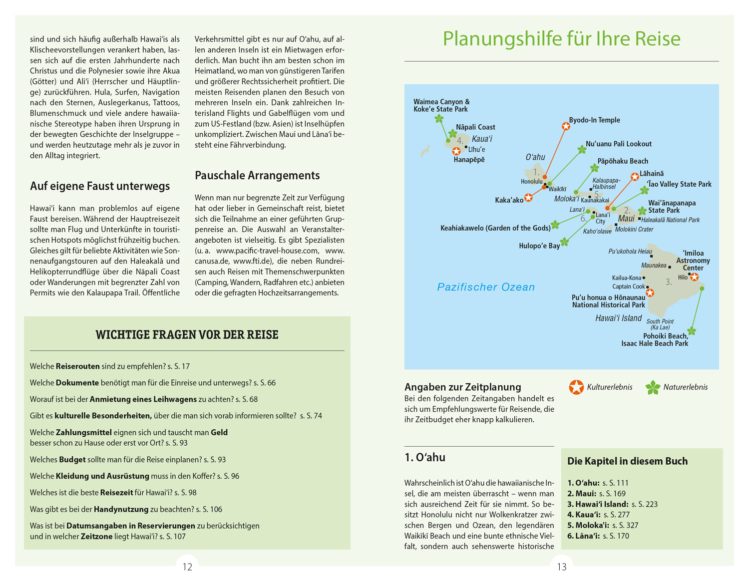 Alle sehenswerten Regionen und Städte werden beschrieben.Zu jedem Kapitel präsentiert eine Doppelseite »Auf einen Blick« die Highlights, die schönsten Routen, aktive Naturerlebnisse und besondere Tipps der Autorin. Ort für Ort hat Sabrina Hasenbein ausgesuchte Unterkünfte, Restaurants und Einkaufsadressen zusammengestellt, die in den Cityplänen eingezeichnet sind. Wanderungen, Radtouren und Roadtrips auf Traumstraßen erschließen die schönsten Landschaften, etwa den Hawai'i Volcanoes National Park auf Hawai'i Island oder das Halawa Valley auf Moloka'i. Viel Wissenswertes über Hawai'i, über die Geschichte und Gegenwart oder den Alltag der Menschen lässt sich in der einführenden Landeskunde wie in den eingestreuten Themenseiten nachlesen.