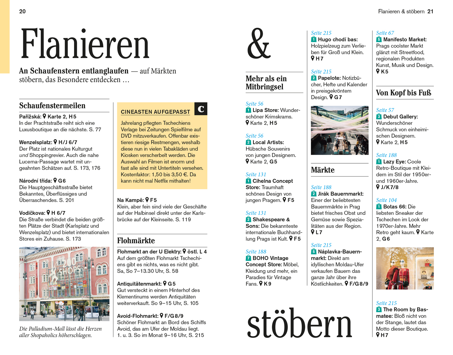Senkrechtstarter, Überflieger, Querfeldein. Vor Ort - die Kapitel: Altstädter Ring und östliche Altstadt, Josefov, die südliche Altstadt, Malá Strana und der Südwesten, Hradschin, rund um den Wenzelsplatz und die obere Neustadt. Das Kleingedruckte (Reiseinfos von A bis Z). Das Magazin. Offene Fragen.