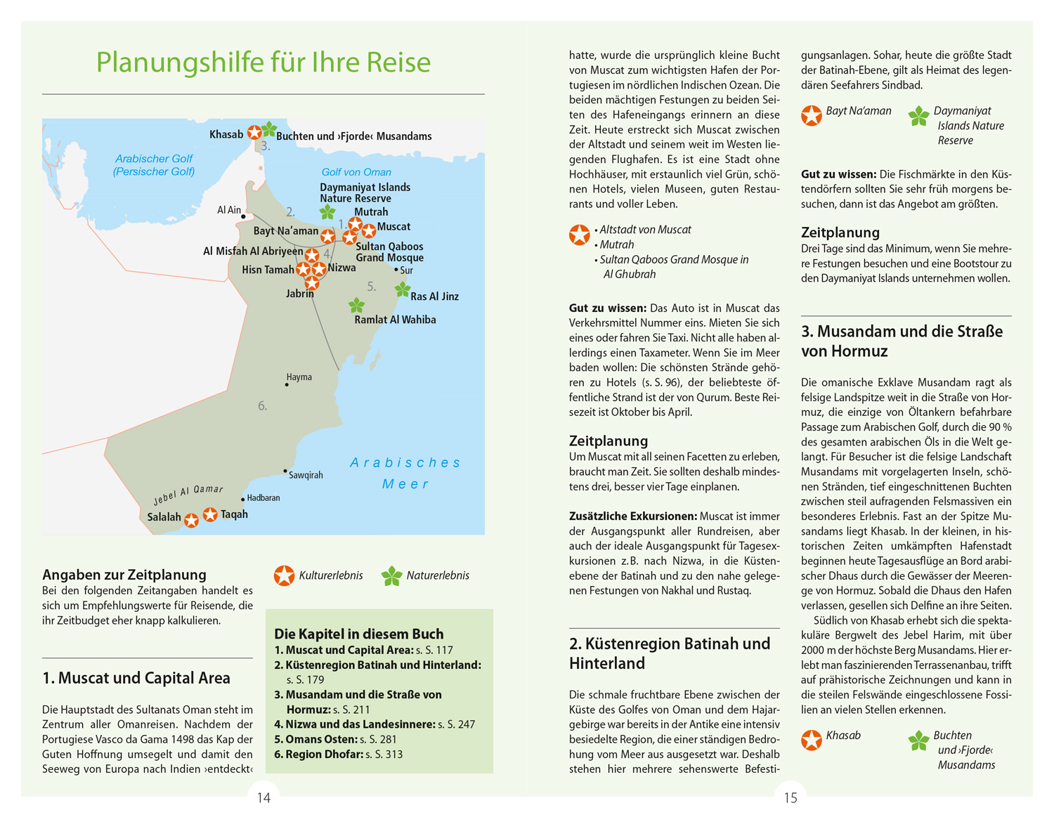 - Muscat und Capital Area, Küstenregion Batinah und Hinterland, Musandam und die Straße von Hormuz, Nizwa und das Landesinnere, Omans Osten, Region Dhofar