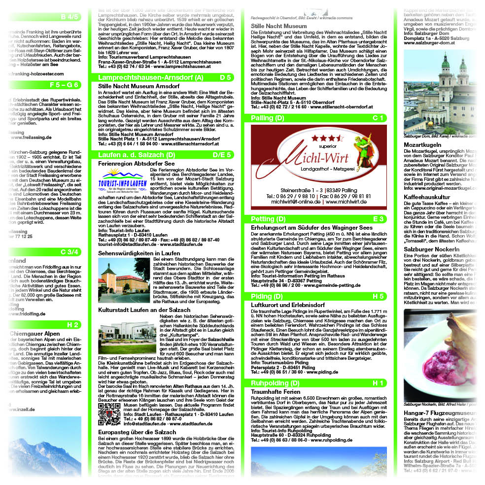 Die Salzach durchzieht den Kartenausschnitt in süd-nördliche Richtung. Bayerische und österreichische Landschaften zu beiden Seitens des Flusses werden durch viele markierte Rad- und Wanderwege verbunden. Erwähnenswert: der Mozartweg, der den biographischen Spuren des Musikgenies folgt; der familienfreundliche Bajuwarenweg, der am Waginger See startend den Spuren der bayerischen Vorfahren folgt. Infos nicht nur zu Salzburg bekommt man auf der Kartenrückseite.