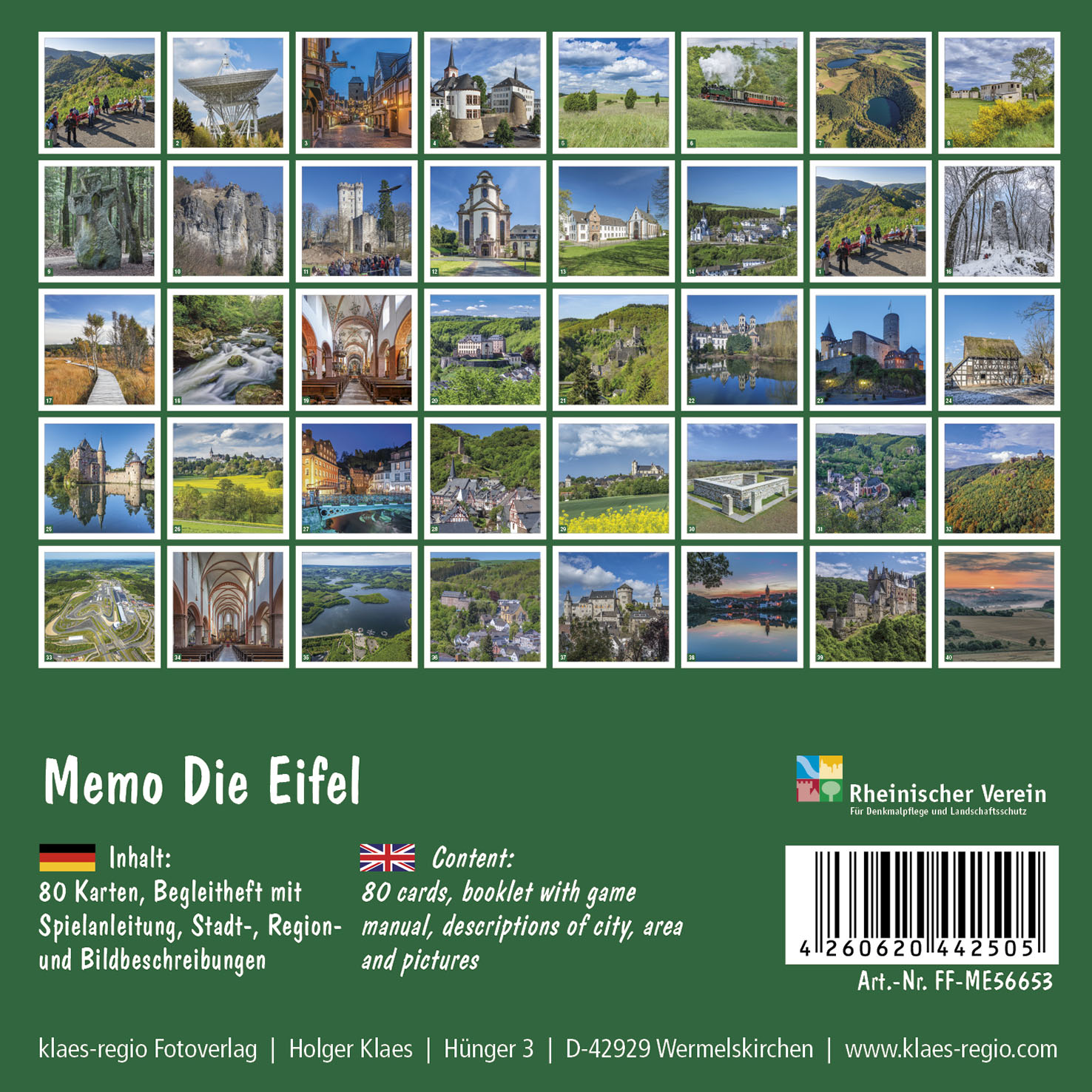 | Zusatzinfo | 80 Spielkarten (40 Bildpaare) mit 40 Stadtansichten, zweisprachige Broschüre (DE/GB) zur Stadtgeschichte und den gezeigten Fotos |
